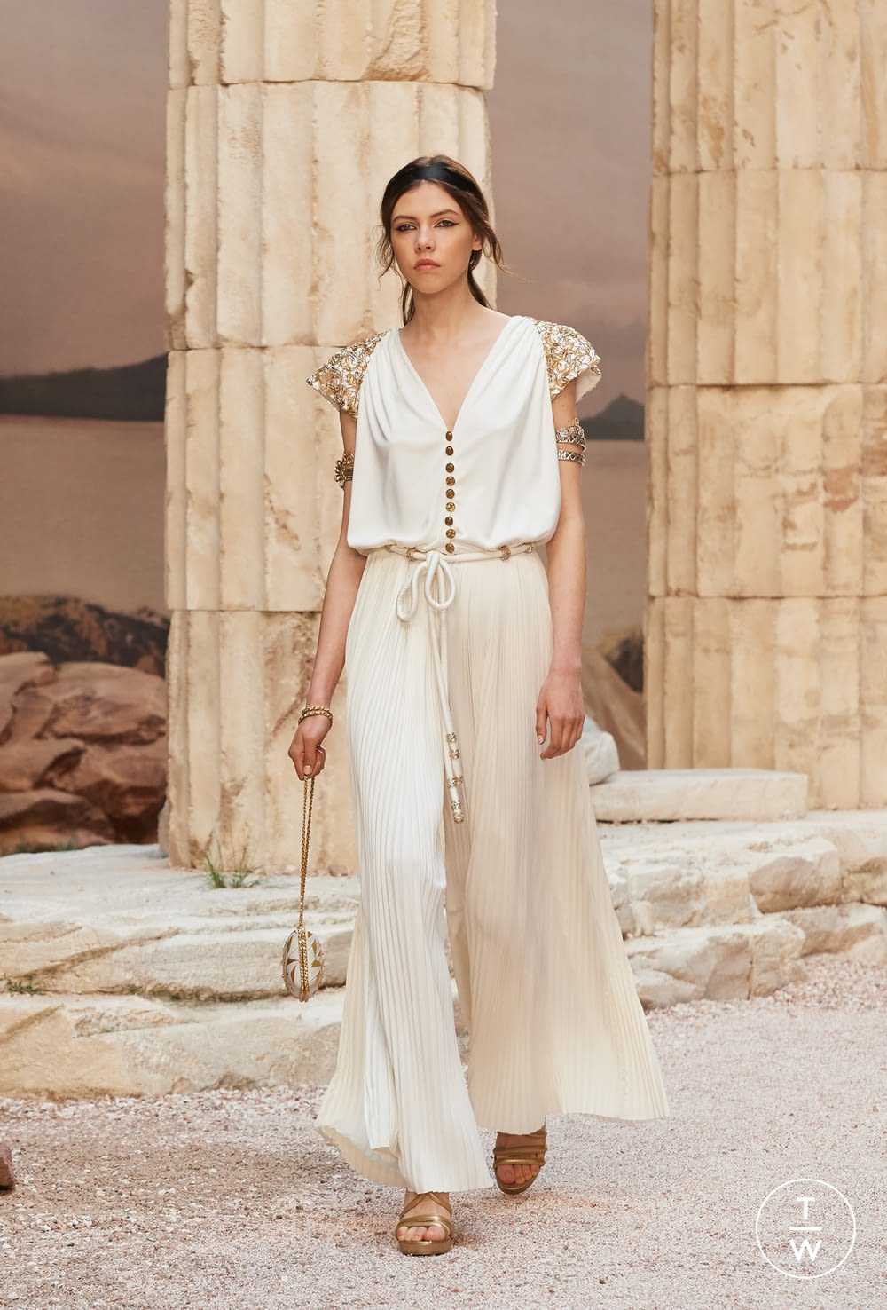 Однако это далеко не полный список возможностей Карла Лагерфельда – чудесник мира моды поставил золотистые аксессуары во главу угла, поэтому его изделия декорированы наплечниками с крупными золотыми пайетками, дополнены подчеркнуто эпатажными поясами, портупеями из золотых лавровых листочков, драгоценными браслетами, сверкающими сандалиями и сумочками.