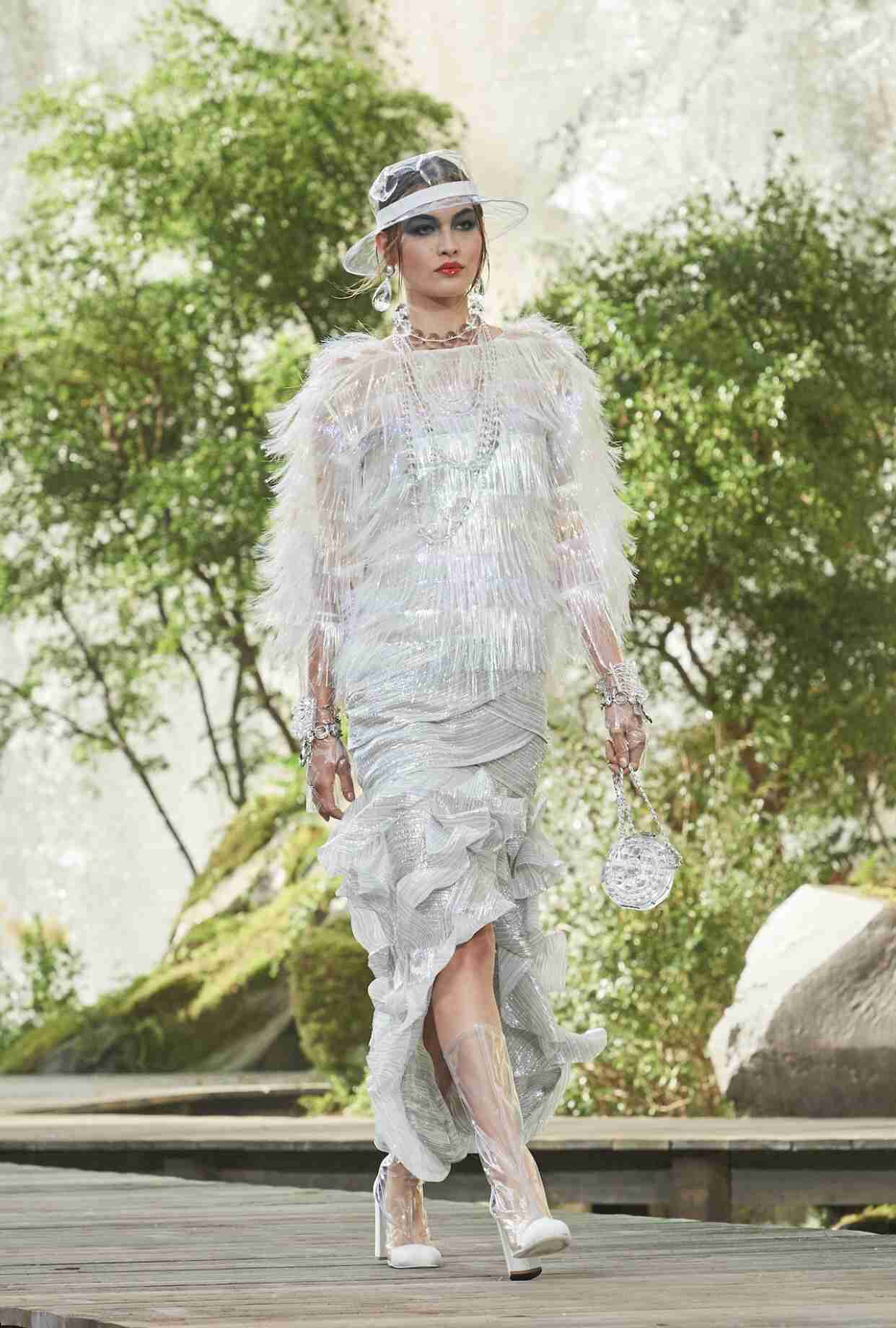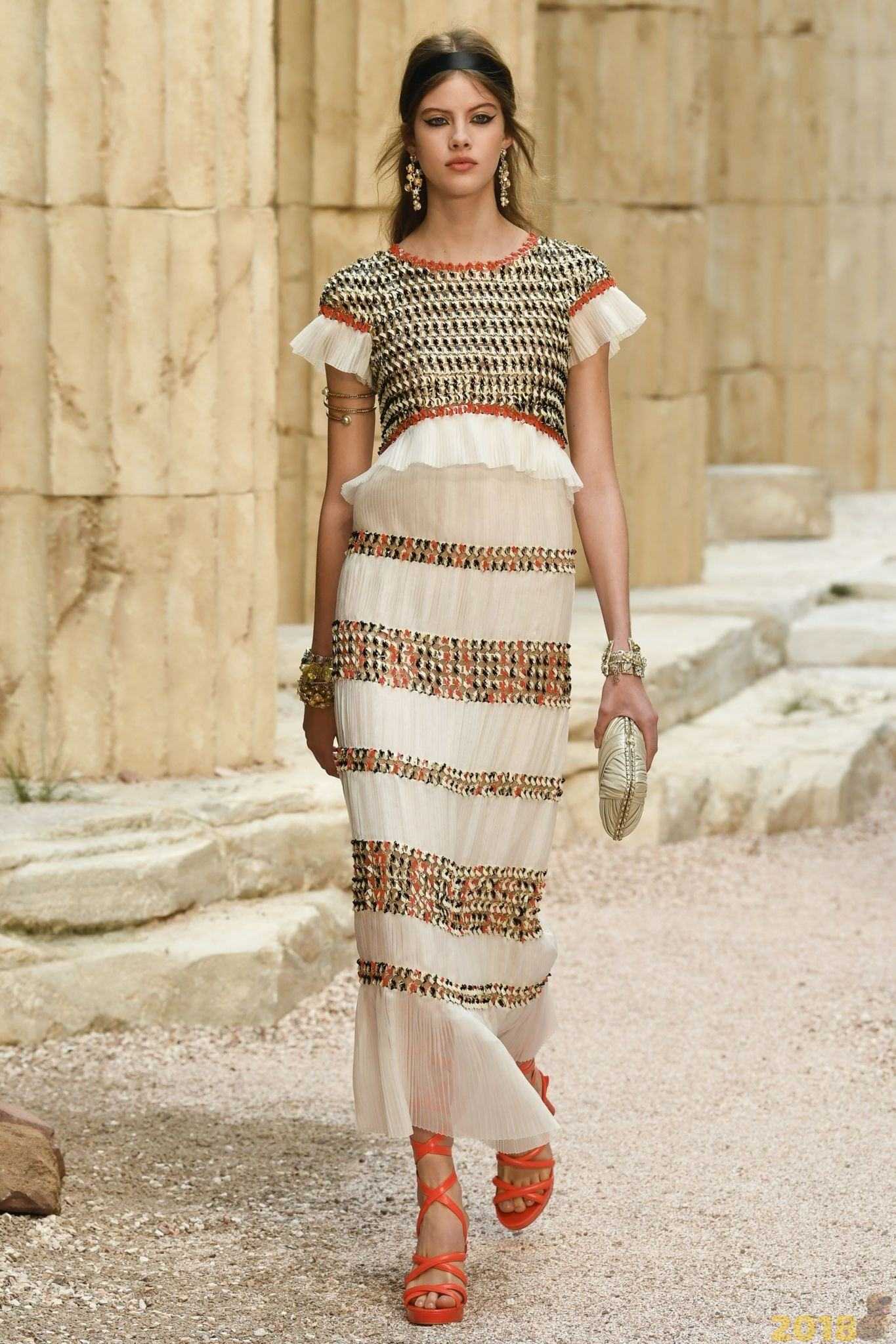 В резорт-коллекции от Chanel можно увидеть актуальные украшения в виде нескольких цепочек, декорированных бусинами и этническими подвесками. Также на моделях можно заметить многоярусные украшения с крупными камнями, металлические чокеры с флористическими мотивами, а также связки крупных и тонких браслетов, отсылающими нас к стилистике арт-деко.