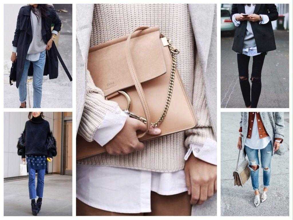 Среди самых популярных схем многослойного стиля — сочетания платья и брюк, укороченных бомберов и классических пальто, удлиненных рубашек и джемперов, сарафанов и свитеров. Эффектным приемом будет надеть юбку поверх платья, а на строгий жакет набросить яркое пальто, не забыв усилить образ платьем сочного оттенка. Ставший классическим, но всё такой же нетривиальный ход надеть два пальто сразу — идеальное решение, когда не получается определиться, какое нравится больше. Также одним из давних способов создать нескучный и при этом гармоничный многослойный образ — сочетать вещи из денима с классическими, как, например, джинсовые рубашки, надетые поверх топов и водолазок, и «разлетные» пальто.
