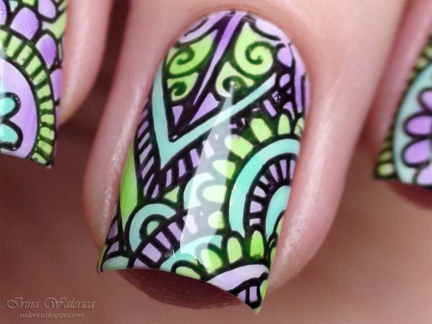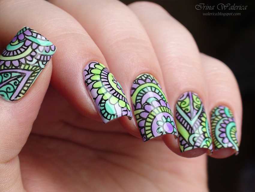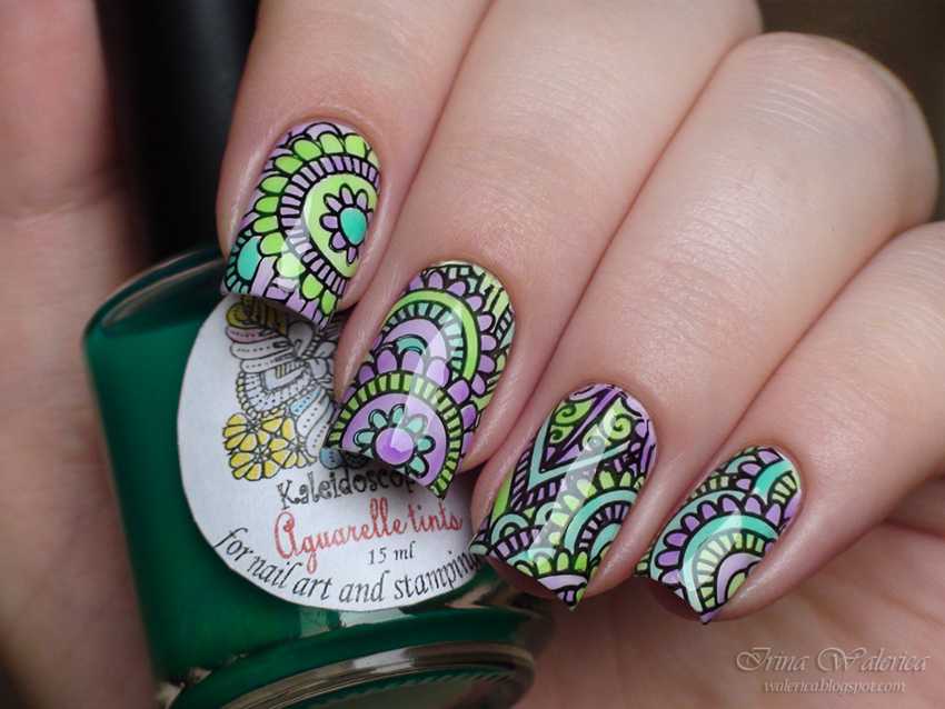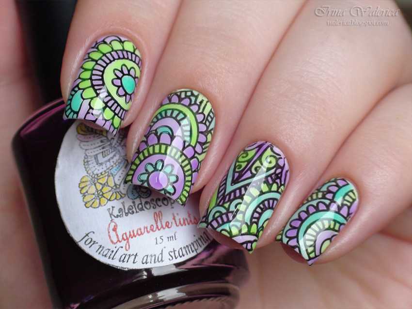 Для раскрашивания Walerica подобрала тинты для ногтей EL Corazon Kaleidoscope Aquarelle tints for nail art and stamping nail art: № a.t.- 02 (салатовый), № a.t.- 02 (бирюзовый), № a.t.- 11 (фиолетовый)