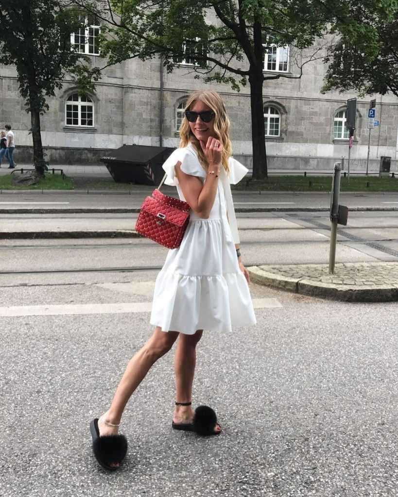 С легким светлым платьем хорошо будут выглядеть коричневые ботфорты, дополнить можно джинсовой курткой. Также к образу подойдут очки с широкой оправой и небольшая сумочка.