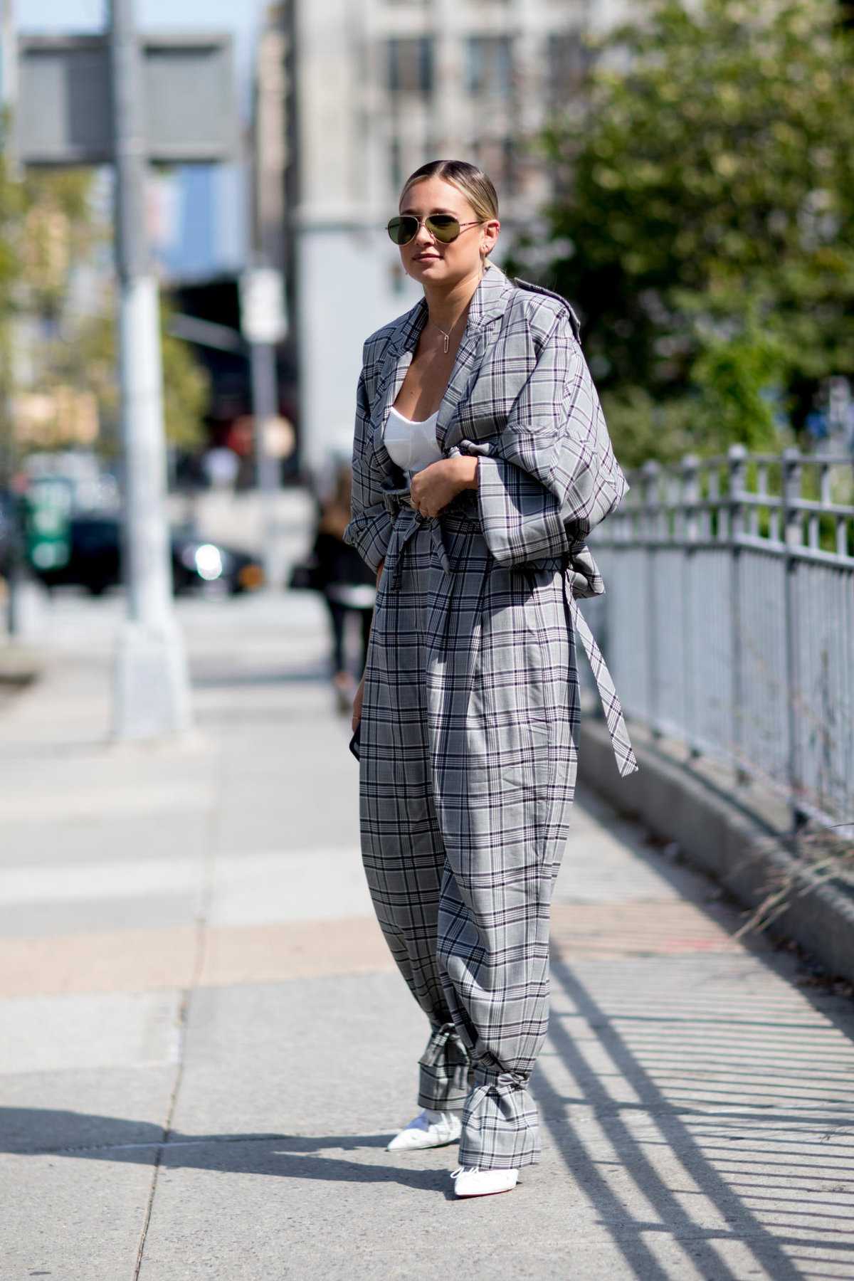 Классно «зайдёт» объёмный пиджак в такую же клетку с ультракоротким топом и низкими кроссовками. С такой обувью может «сработать» и гольф.