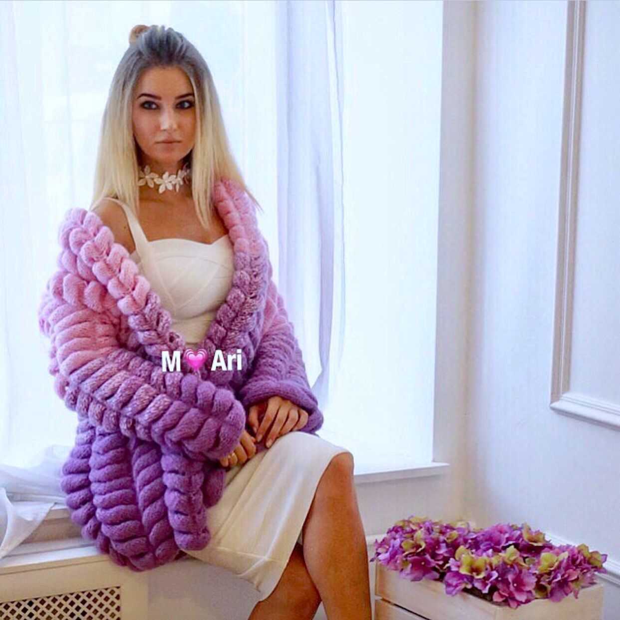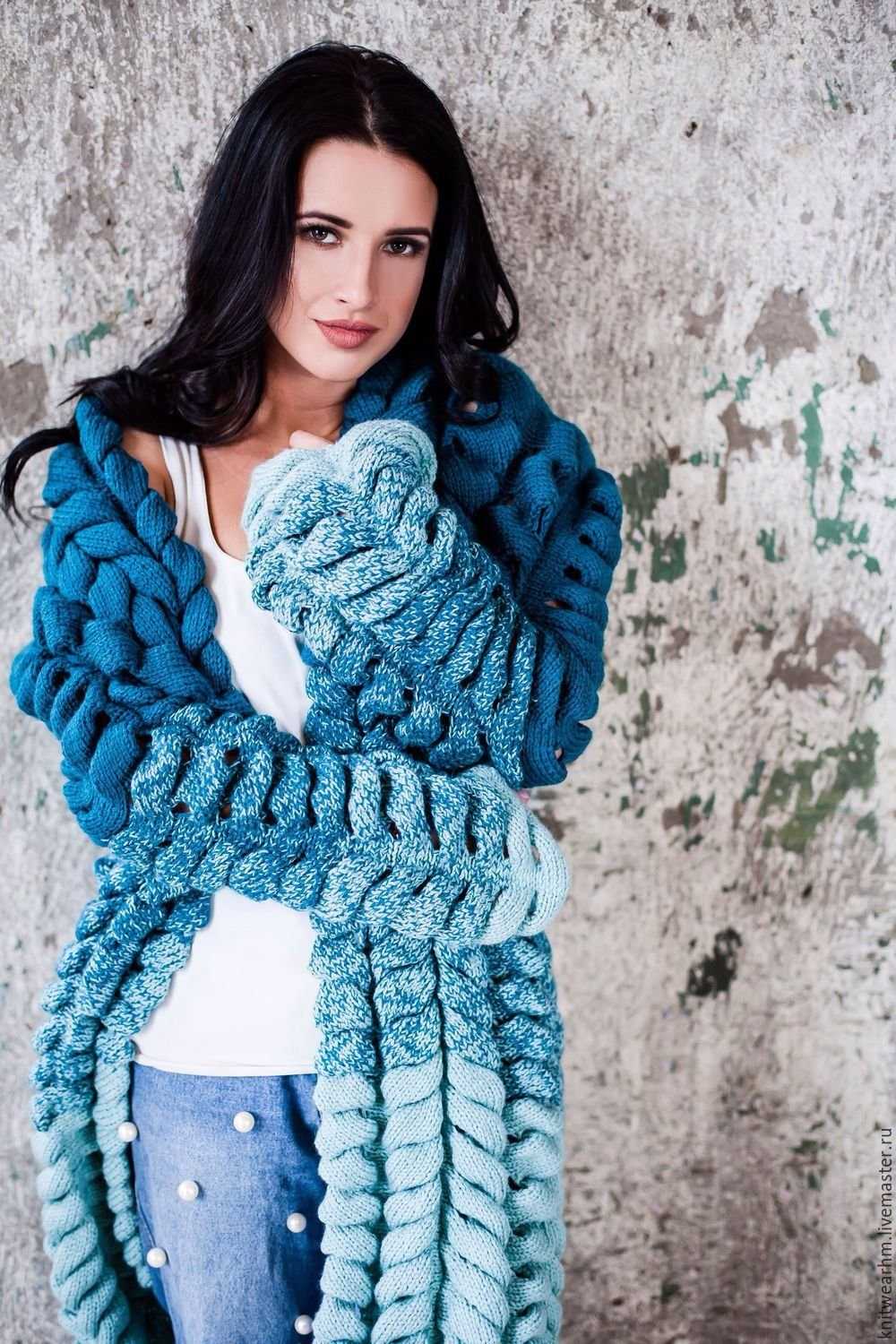 Для изготовления таких кардиганов используют специальную толстую пряжу, которую вывязывают петлями наружу