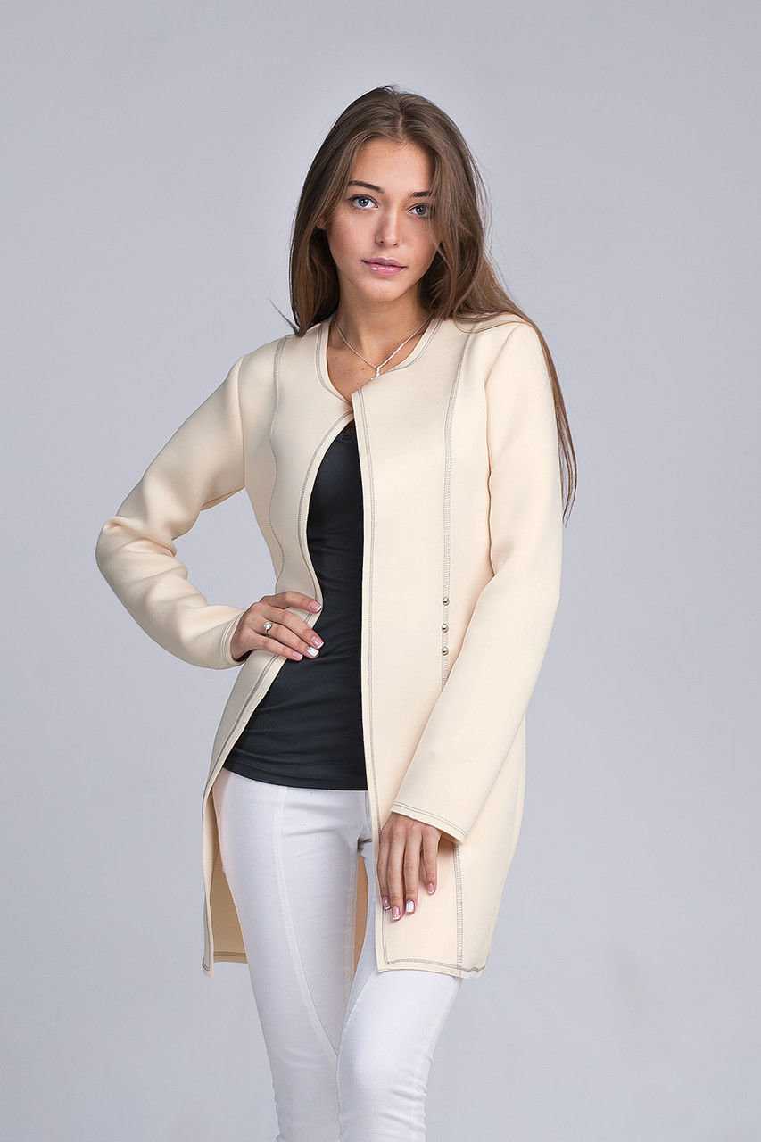 - Неопрен — искусственный материал. Не мнется, легко стирается. В то же время ткань плохо пропускает воздух. Изделия из неопрена подчеркивают красоту женского силуэта. Модели А-образного кроя подбирают к облегающей одежде. С кардиганом укороченного фасона хорошо смотрится плиссированная юбка.