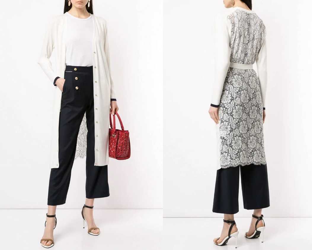 Также будут популярны модели с вставками или планками из тонких прозрачных тканей. Для изготовления таких кардиганов используется более мелкое плетение, которое выглядит намного тоньше и легче. В них, конечно, будет не так тепло, но зато в тренде. Для повседневной носки отлично послужит удлиненный кардиган на молнии – такая вещь смотрится спортивно и подходит под соответствующий лук: обтягивающие джинсы или укороченные модные брюки, кеды или кроссовки.