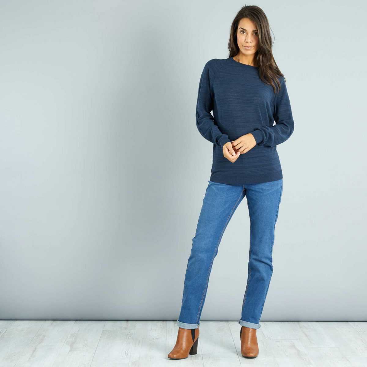- Великолепным решением станет свитер, при этом не имеет значение, каким он будет. С рваными джинсами хорошо сочетаются объемные или тонкие, однотонные или с рисунком пуловеры. Модным выбором станет верх с асимметричными рукавами или большими горловинами.