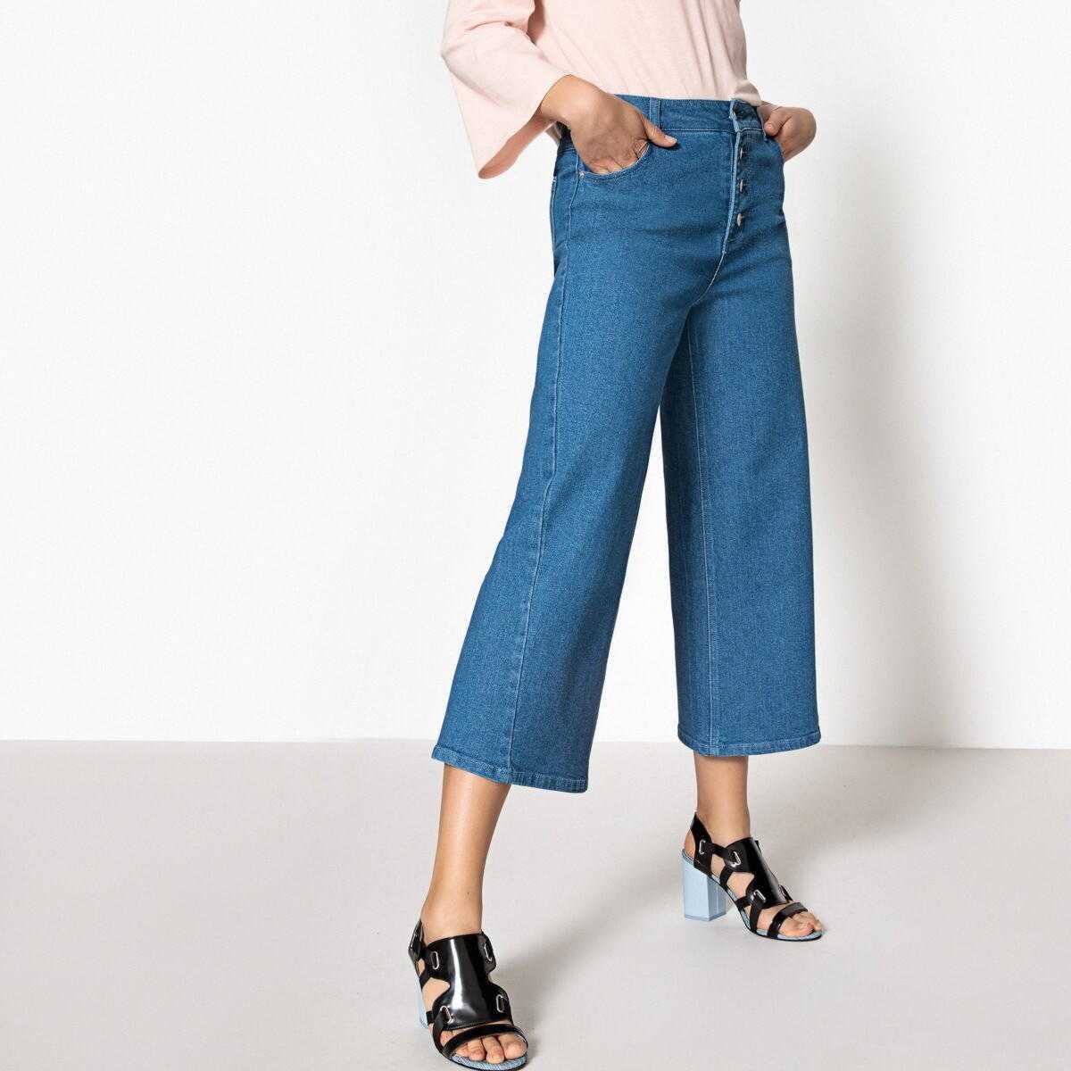 Фасоны широкого кроя подходят девушкам практически с любым типом фигуры. По фасону расширяются брюки уже от бедра. Скрадывают недостатки фигуры и корректируют ее. Девушкам с треугольной фигурой будет приятно узнать, что подобный фасон позволит визуально увеличить зону бедер и сделать фигуру более пропорциональной. Обладательницам широких бедер джинсы помогут скорректировать фигуру, зрительно удлинив ноги.