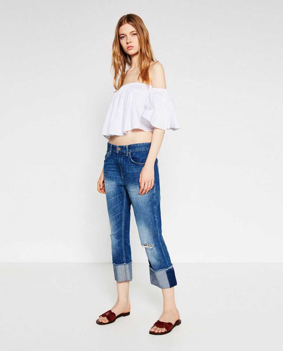 Например, можно надеть джинсы-бананы с оборванными краями в комбинации с кроп-топом