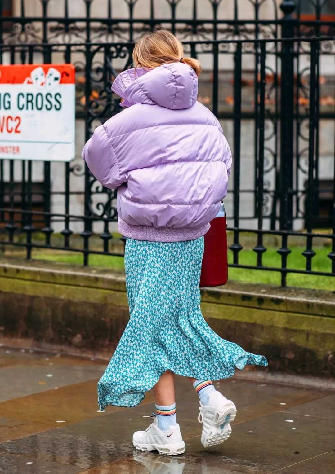 Спортивный стиль в прохладную погоду хорошо смотрится с коротеньким оверсайз. Завершит лук маленький рюкзачок и массивная обувь.