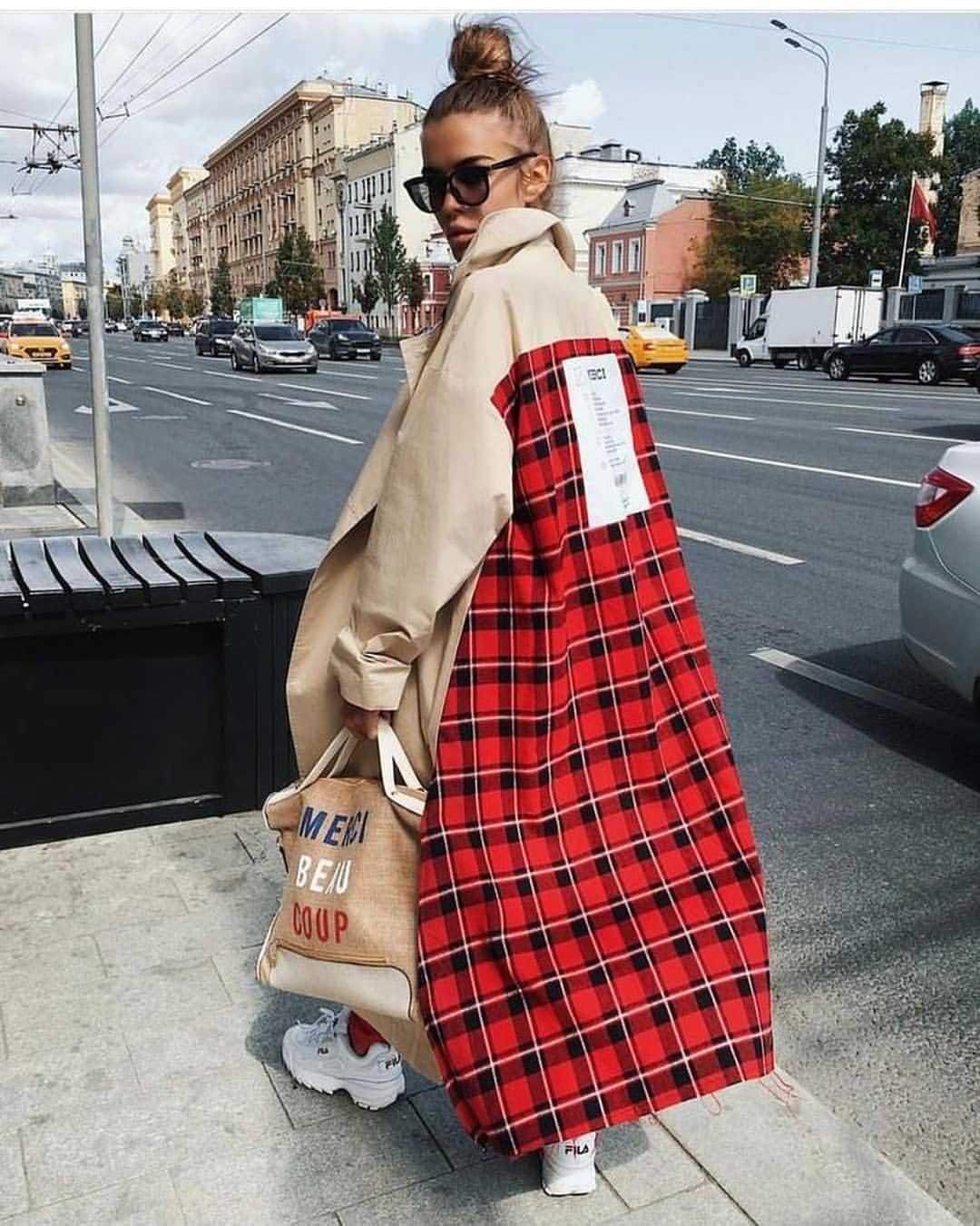 - Традиционно выглядит пальто оверсайз в клетчатом исполнении. Чёрно-белый или красно-белый вариант практически уже перешёл в разряд классики.