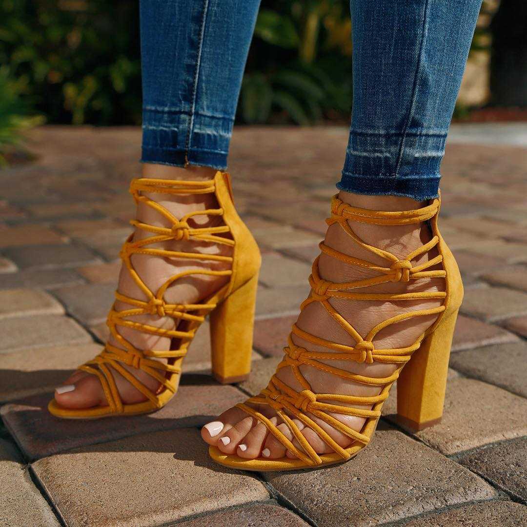 Тонкие ремешки переплетающиеся вокруг лодыжки могут совмещаться с толстым устойчивым каблуком.