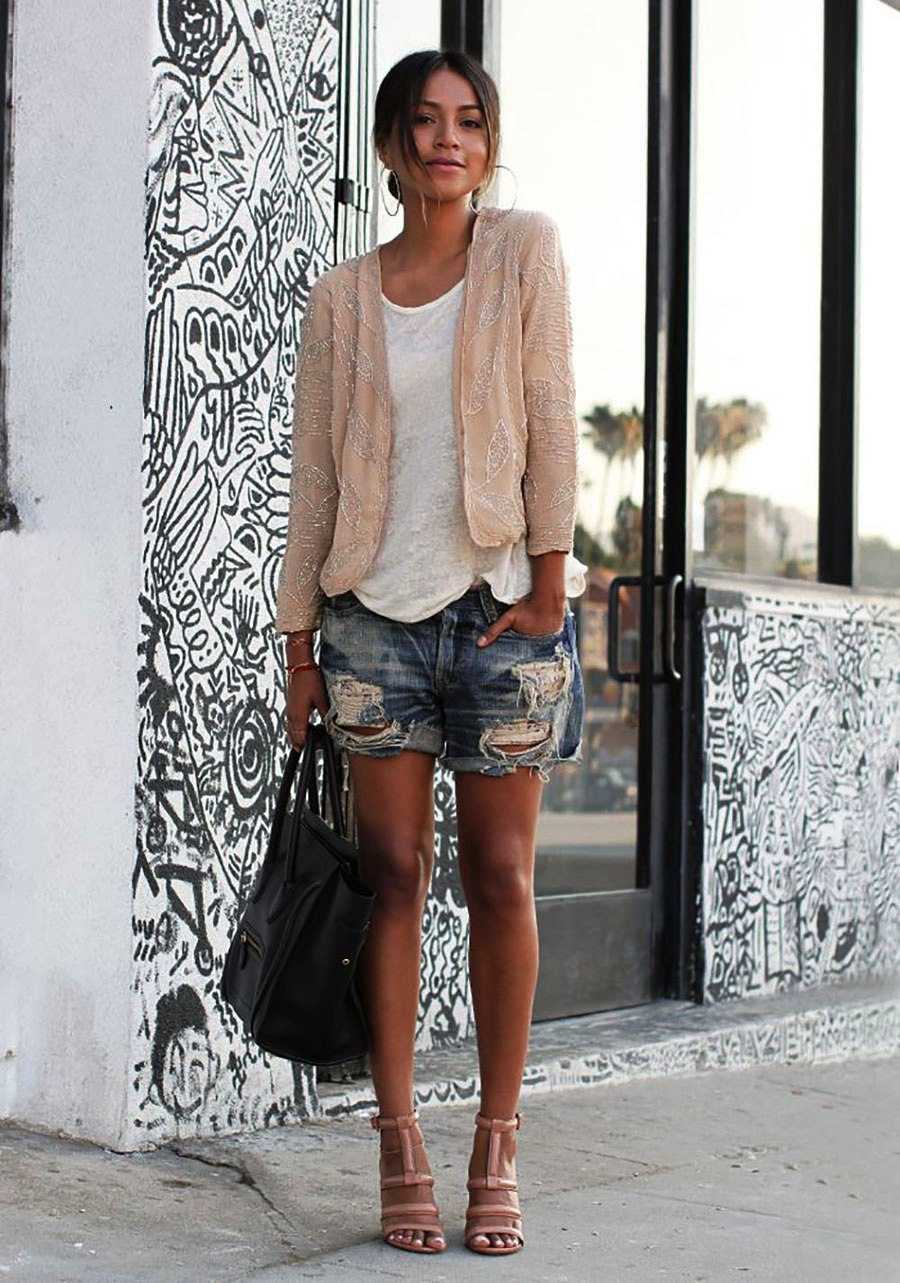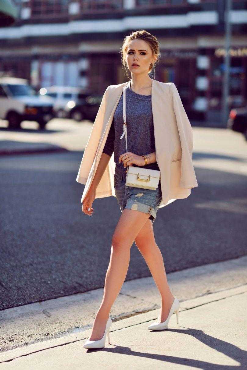 Одна модель джинсовых шорт может стать главным элементом сразу нескольких образов. Если вы дополните их классическим пиджаком черного, синего или белого цвета, то у вас получится практически деловой образ, с ноткой непринужденности и собственного стиля. При этом позаботьтесь об обуви (туфли-лодочки или босоножки на платформе) и аксессуарах (клатч или сумочки на цепочке).