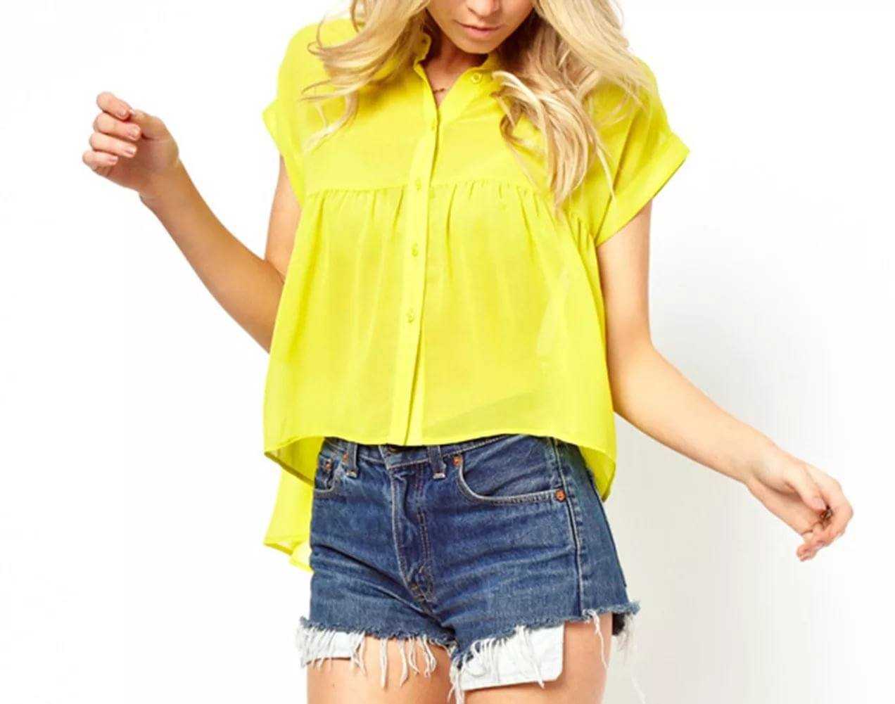 Выбирая блузу или рубашку под джинсовые шорты, отдавайте предпочтение ярким оттенкам. К примеру, с джинсой хорошо смотрится лимонно-желтый или малиновый цвета.