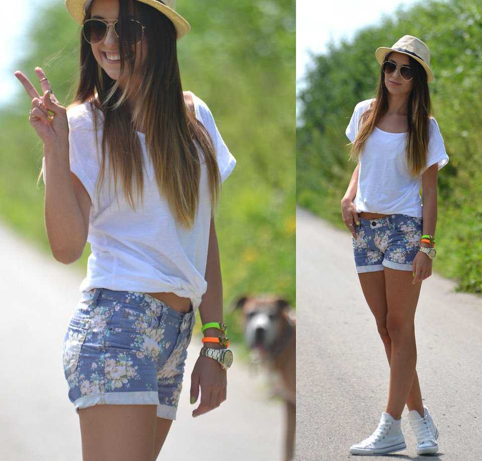 - если выбрать блузку с цветочным принтом или яркой расцветкой, то шорты нужны однотонные. Такое сочетание создать хороший контраст.