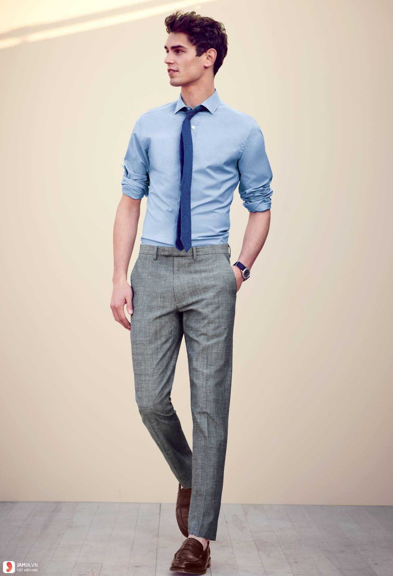 Чтобы завершить образ, добавьте рубашку, галстук и кожаные ботинки Дерби — это подойдет, например, для вечернего приема. А если надеть футболку с треугольным вырезом и кожаные кеды, то можно отправиться на ужин с друзьями.