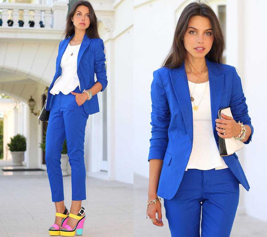 Несомненно, что сочетание серых брюк и белой рубашки является классическим и прекрасно подходит для офиса. Для белой блузы или рубашки рекомендуется подбирать более темные оттенки, что бы они не терялись. Чтобы сделать образ более ярким его можно дополнить синим пиджаком, цвет преимущественно темный королевский. Для брюк модели скинни выбирайте удлиненные пиджаки с большими карманами, а для широких или расклешенных брюк – более короткие модели.