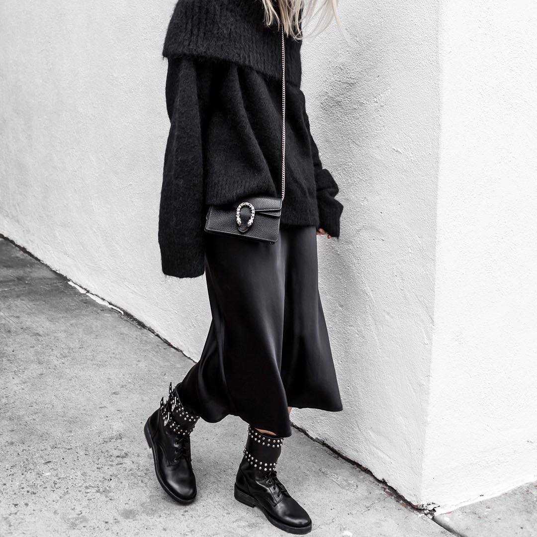 Мохер и шелк, женственная юбка и грубые ботинки — контрасты, которые от черного исполнения только выигрывают. Photo: FIGTNY.com