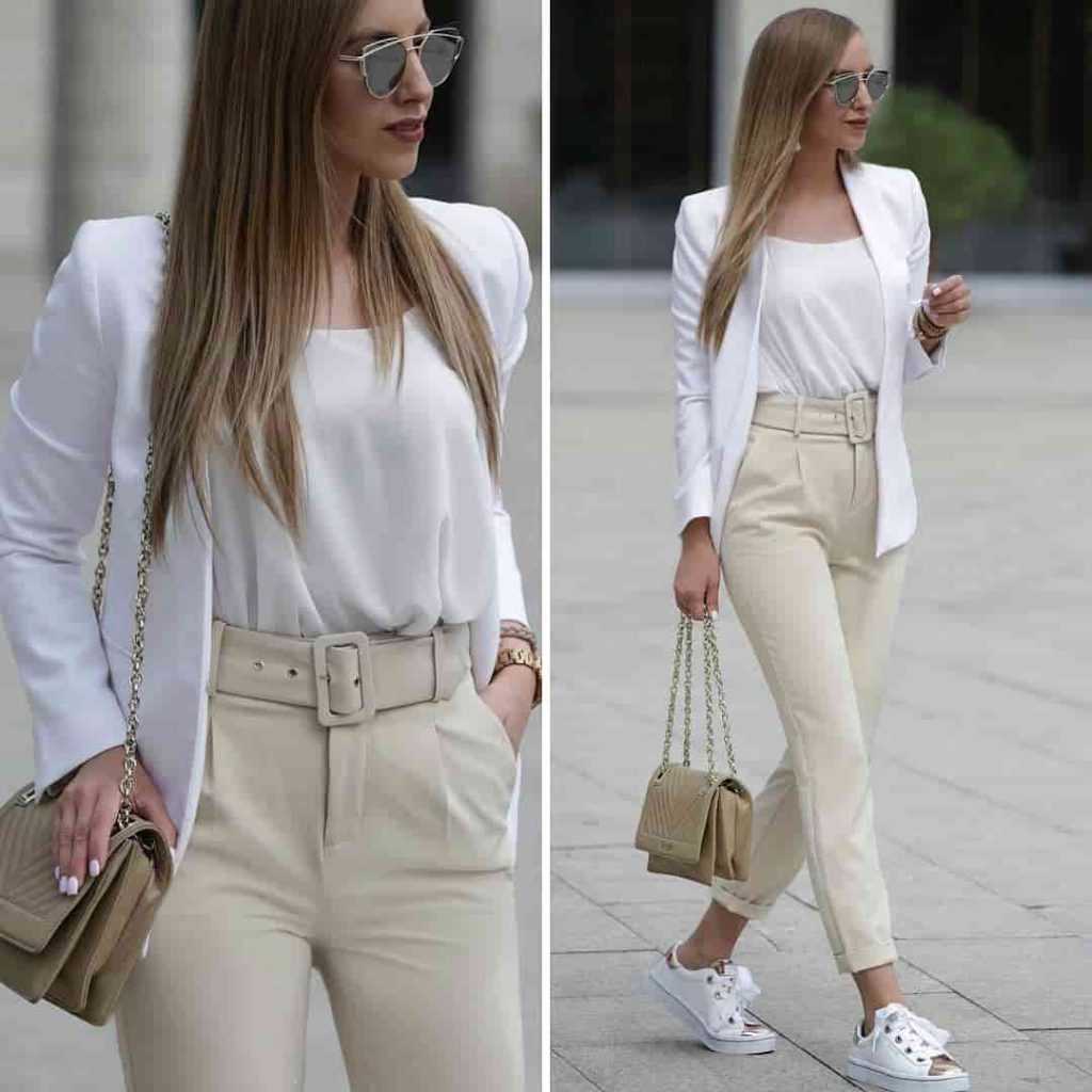 Образы в виде брючных костюмов типа оверсайз и обуви спортивного плана становятся полюбившейся классикой. Чтобы собрать лук в стиле спортивный шик, сочетайте джинсы с высокой посадкой, жакет, кроссовки и клатч на цепочке. Интересно смотрится платье-трапеция со светлыми мокасинами и сумочкой на ремешке. Аутфит получается легким и очень женственным.