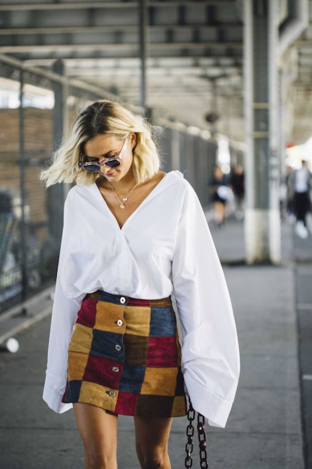 Ещё одна идея, с чем носить рубашку-оверсайз. Юбка может быть длинной или короткой, облегающей или просторной. О том, как заправлять рубашку в юбку, существует целая философия. Многие девушки заправляют рубашку лишь спереди, сзади оставляя ниспадать свободно. Такой стиль подчёркивает стройность и неформальность, создаёт соблазнительные вертикальные складки.