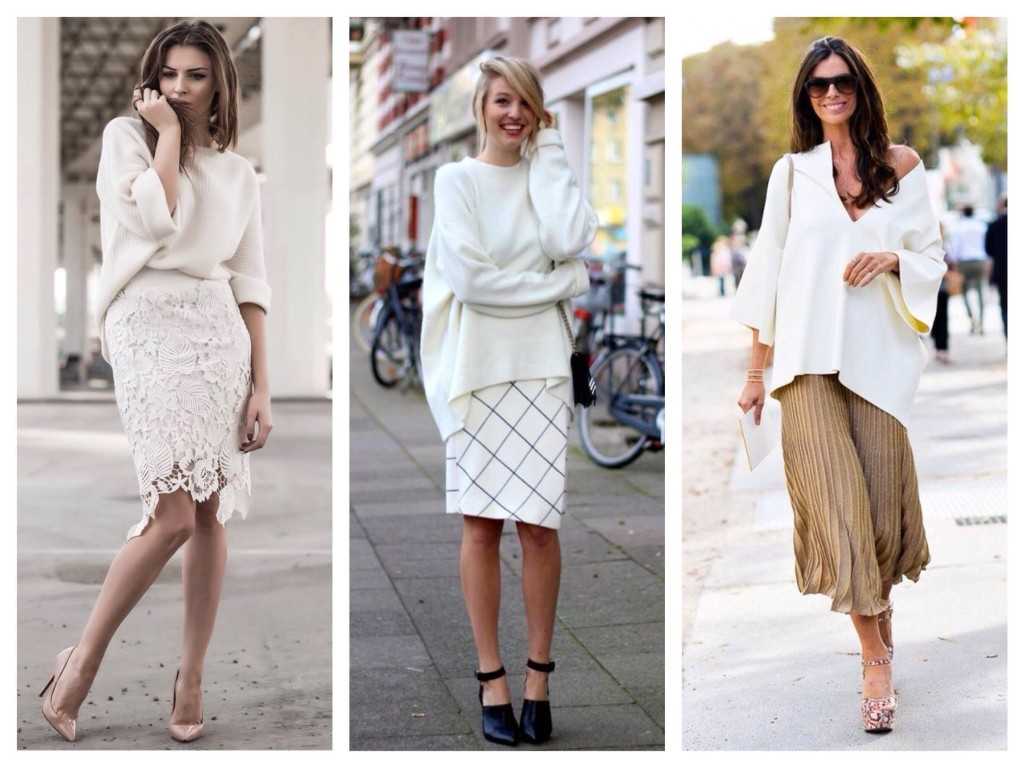 Попробуйте свитер в сочетании с легкей длинной юбкой из шифона, шелка или хлопка — это всегда выглядит женственно и элегантно. Если больше по душе мини-юбки, вам понравится лук с укороченным трикотажем и привлекательной обувью.