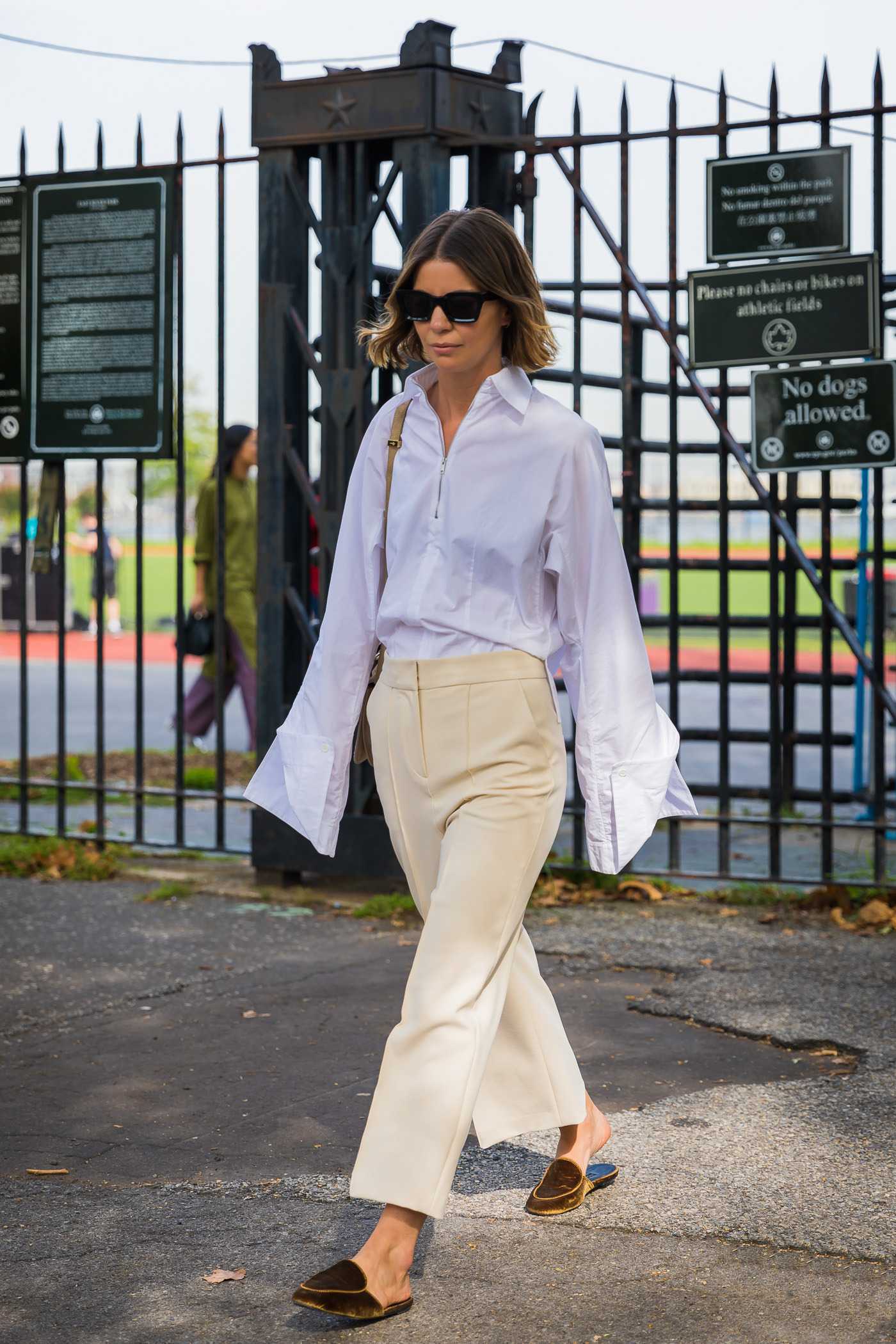 Актуальным дополнением считаются брюки. И в этом случае ограничений практически не существует. Женская длинная белая рубашка прекрасно смотрится с классическими штанами в деловом стиле. Длина изделий может быть стандартной или завышенной – 7/8 или 3/4. Модели оверсайз, в клетку или асимметричного силуэта стилисты предлагают комбинировать с облегающим низом – лосинами, кожаными брюками, трикотажными или стрейчевыми фасонами. Оригинальным считается вариант заправленного верха спереди и выпущенного на спине. Стильным завершением будет обувь на каблуке или ровном ходу.