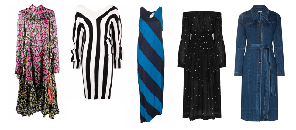 Для девушек в тренде будут платья с геометрическими принтами и полосками с асимметрией, цветочным принтом или горошком. Главное – узор не должен быть слишком крупным и ярким.