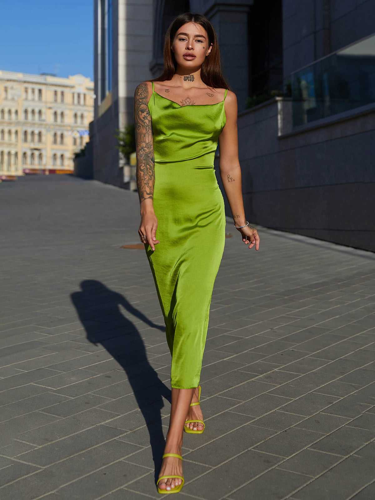 Это длинное платье из атласной, сияющей ткани с вырезом на ноге.