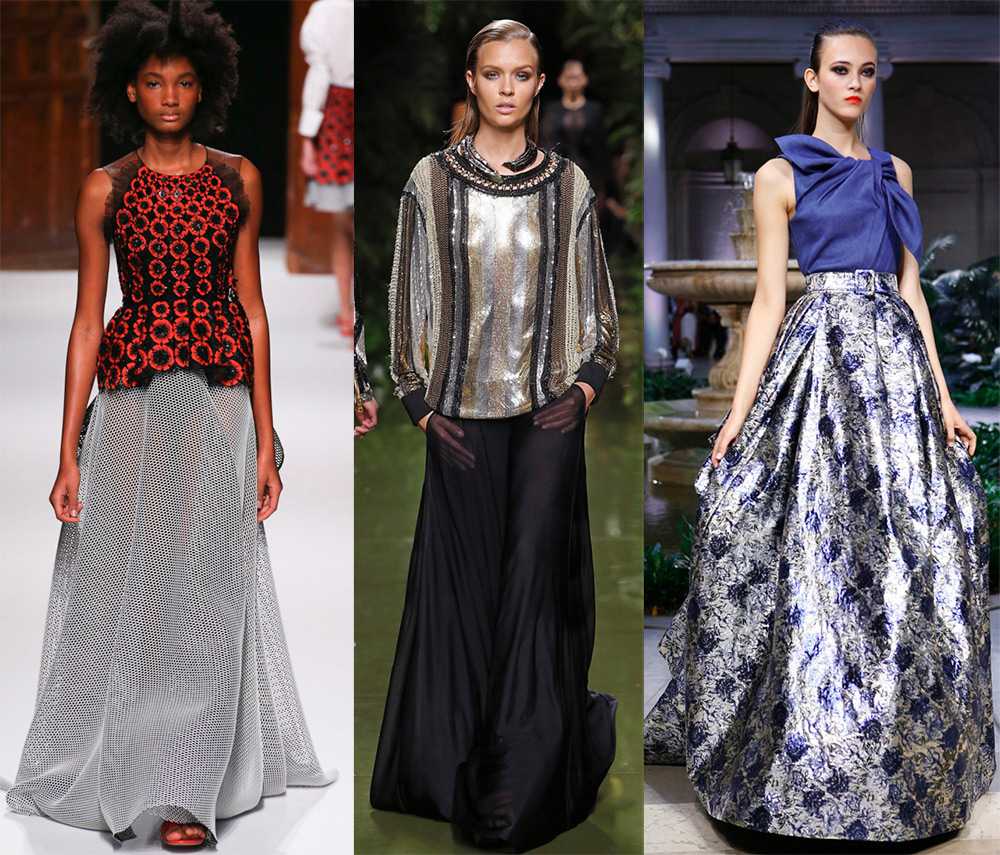 Также приветствуется асимметрия, наличие декора в виде кожаных ремешков, воланов, рюшей, оборок, вышивки, металлических пряжек, драпировки, узоров из камней, страз и пайеток.