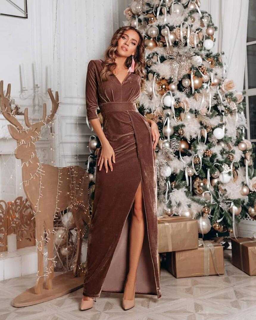 Ультрамодный вариант женской одежды для праздничной ночи – однотонное длинное платье из футера, например, оливкового цвета. Это очень уютный look, подходящий для домашних посиделок или уличных гуляний.