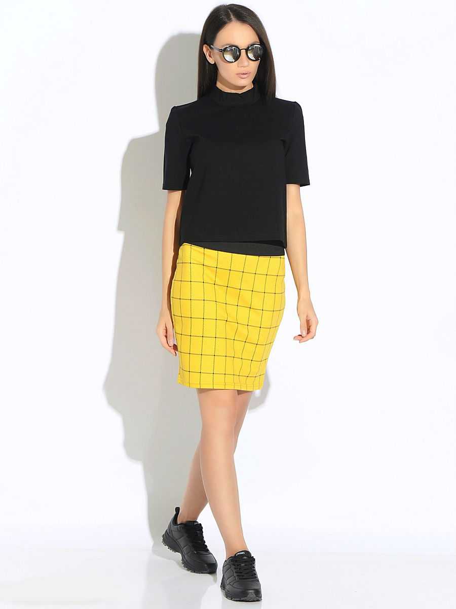 - Мини-юбка. Жёлтая модель смотрится довольно откровенно и вызывающе, особенно если она совсем короткая. Такой вариант следует носить с закрытым верхом, подойдут шёлковые чёрные блузки, тонкие свитшоты, а также рубашки и топы. Сверху можно накинуть классический жакет.