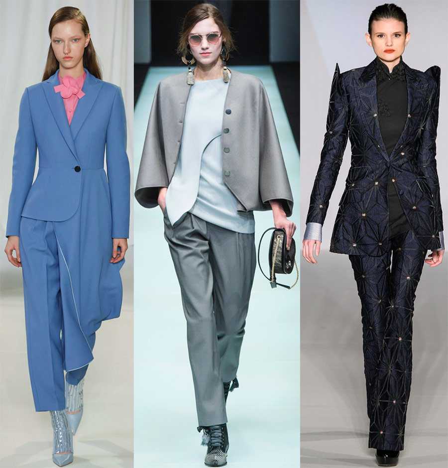 Очень популярны комплекты с верхом по типу джинсовой куртки, затягивающиеся на талии пояском. Такие костюмы подчеркивают хрупкие женственные линии и отлично сочетаются с обувью на каблуке.