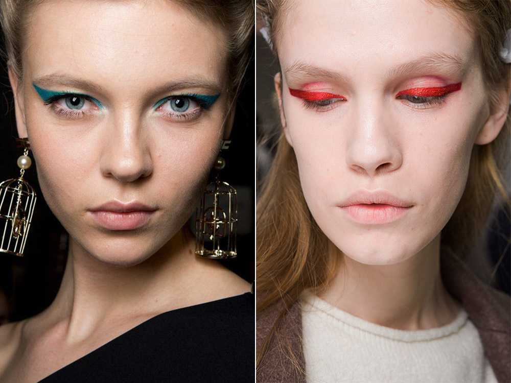 Главное в таком модном макияже зимой- 2021 — яркая и броская подводка верхнего века в виде «стрелок». В этом сезоне они не имеют ничего общего с классическим вариантом. В первую очередь, благодаря цвету, традиционный черный уступил свое место фиолетовому, лазурно-синему, зеленому, а в самых авангардных вариантах – оранжевому и розовому.