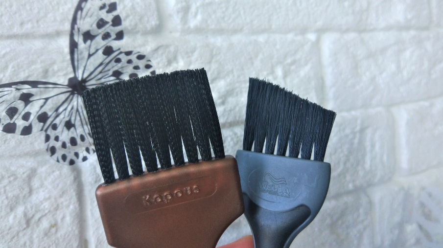 - Кисть. Кисть имеет пластиковую рукоять и ворсистую часть. Оптимальная ширина кисти – от 3 до 5 см. Ворс должен быть средней жесткости – так он сможет держать заданный кисти наклон, но не травмировать кожу голову. Жесткие кисти часто применяют для длинных волос – плотный ворс помогает одновременно распределять краску и распутывать волоски, но для корневой части такая кисть не подойдет – будет раздражать кожу головы;