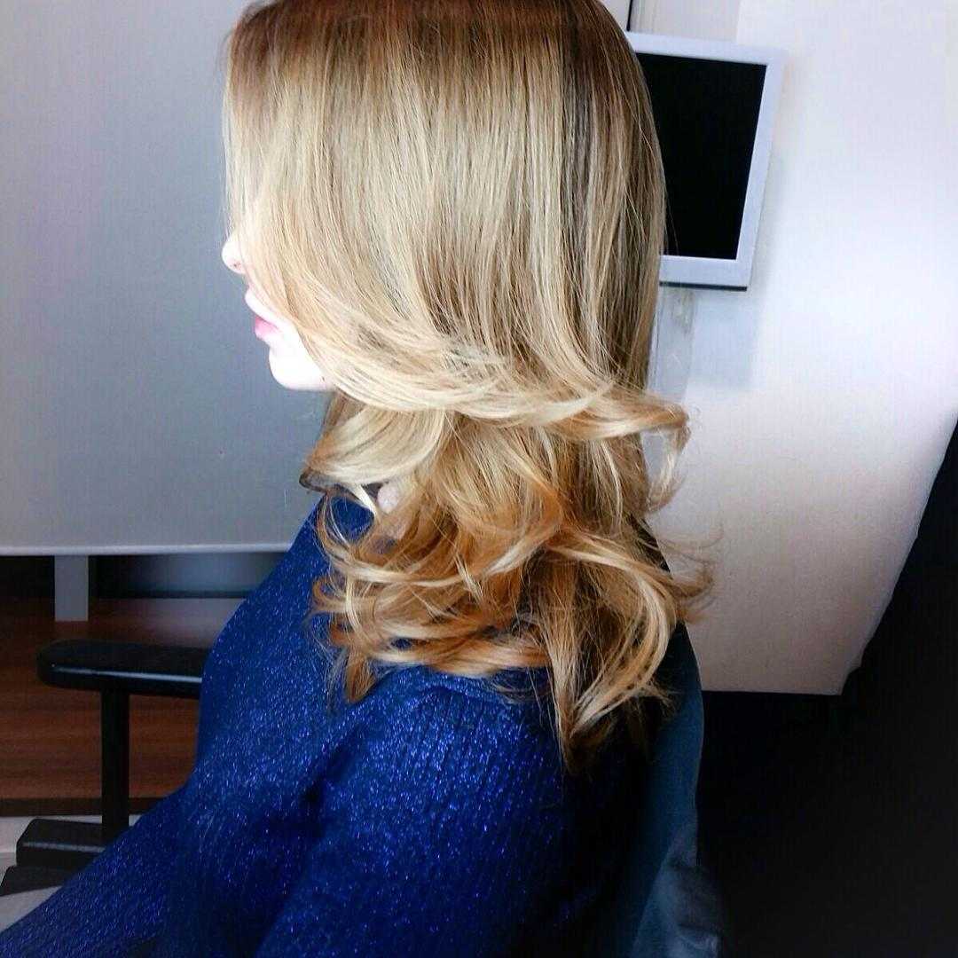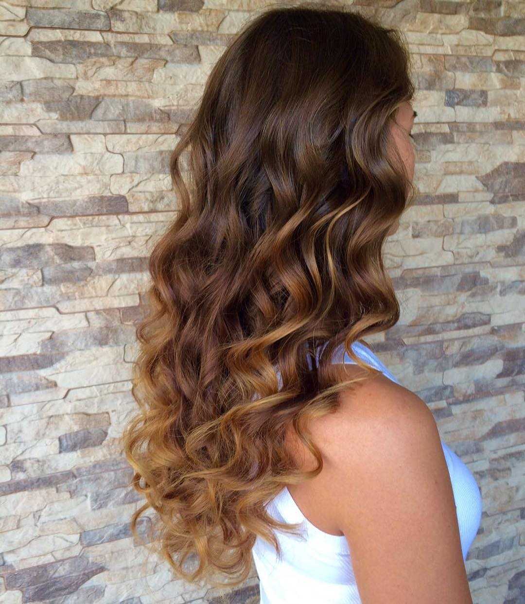 Краску на длинные локоны наносят, отступив от корней, и максимально размывают линию перехода с помощью сухой кисти. Это позволяет создать блики.