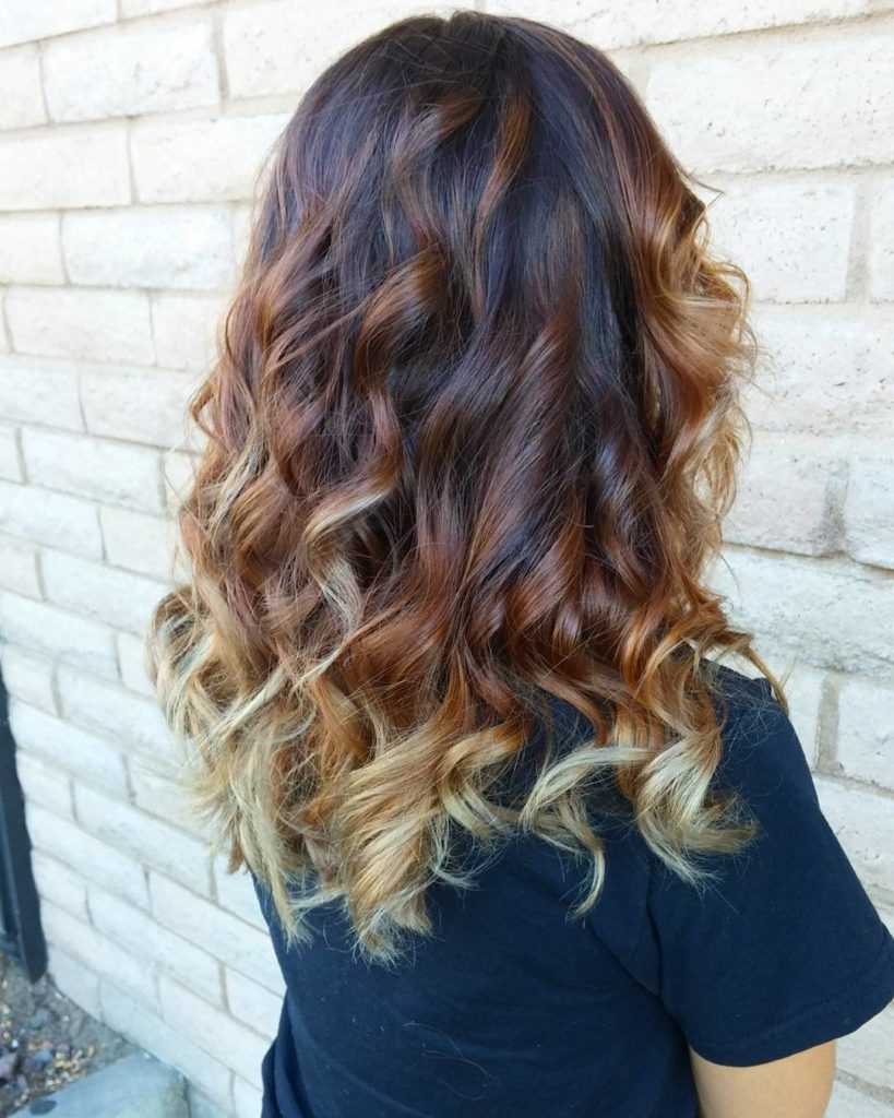 Обладательницам таких кудрей легче всего добиться трендовой натуральности. Мастера рекомендуют начинать окрашивание у пробора. Для этого волосы разделяют на произвольные локоны, под которые подкладывается фольга с блондараном. Естественные, градуированные пряди отлично освежают лицо и привносят оригинальные нотки в привычный образ.