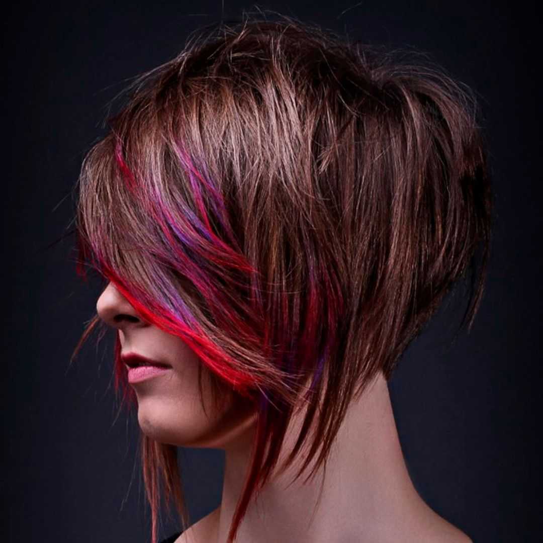 Сделать многослойную стрижку индивидуальной, запоминающейся поможет создание четких переходов между ярусами, выстригание геометрических форм, яркое или контрастное окрашивание. Хорошим примером служит прическа с квадратными или треугольными слоями