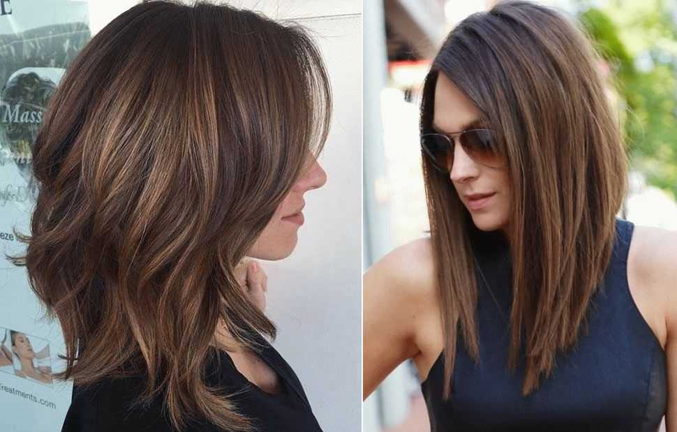 - Удлиненный боб не сдает свои позиции. У этой стрижки длина передних локонов должна быть ниже подбородка, но не достигать плеч, имея плавный переход к более коротким. Это удачный вариант для прямых волос средней длины, особенно для густых и темных.