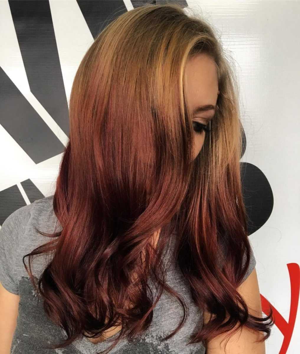 Казалось бы, просто темно-рыжий. Но дома такой точно не получится. Только мастер при помощи монохромного колорирования сможет достичь нужного оттенка. Рубиновые брызги с голографическим оттенком: вот в чем сложность. И только они способны дать этот яркий, ошеломляющий модный цвет.
