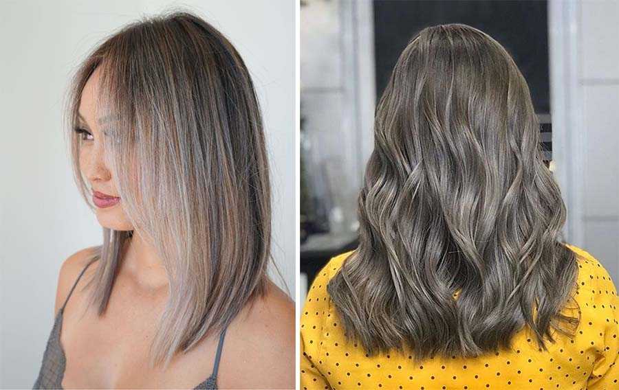 - Пепельный или серебристый. Холодная палитра становится очень востребованной. Разные оттенки серого создают роскошный натуральный вид. В то время как многие пытаются скрыть седину, другие решили ее популяризировать. Проводить окрашивание следует в салоне у опытного мастера. Ориентируясь на цветотип клиента, он подберет наиболее подходящий оттенок пепельного и плавно совместит его с натуральным. Но цвет будет нуждаться в постоянном уходе. Со временем любая краска смывается, и на локонах появляется желтизна. Для борьбы с нежелательными эффектами можно приобрести специальный оттеночный шампунь или обновлять цвет в салоне при помощи тонировки.