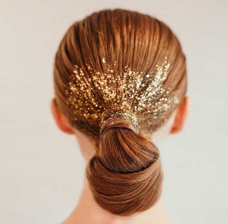 - Прически с блестками – необычный тренд предстоящего сезона. Глиттер идеально сочетается с косами и парой пучков. Тогда можно украсить пробор, один или несколько элементов плетения. Выглядит очень необычно, ярко и красиво.