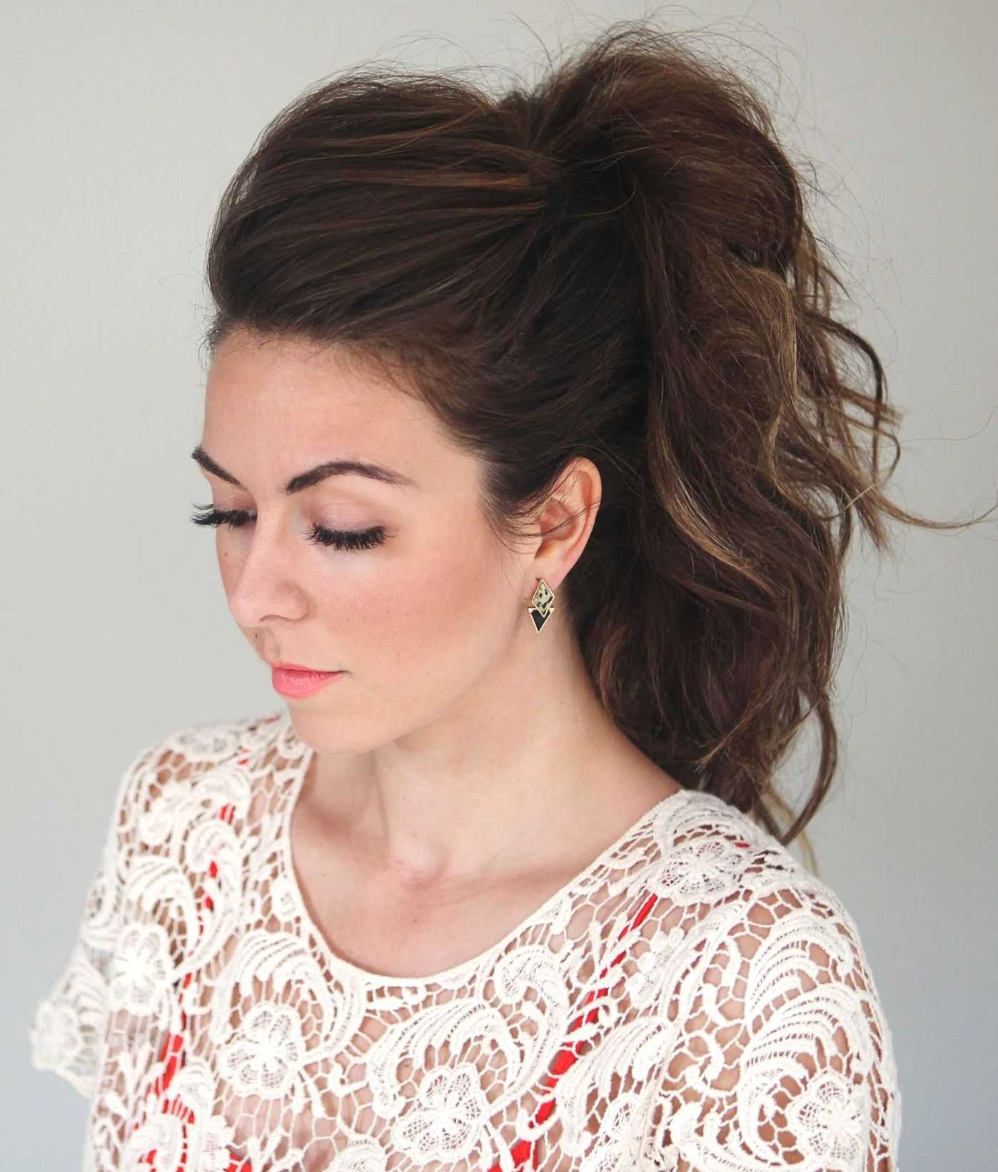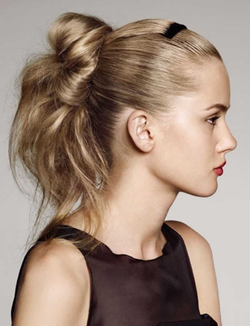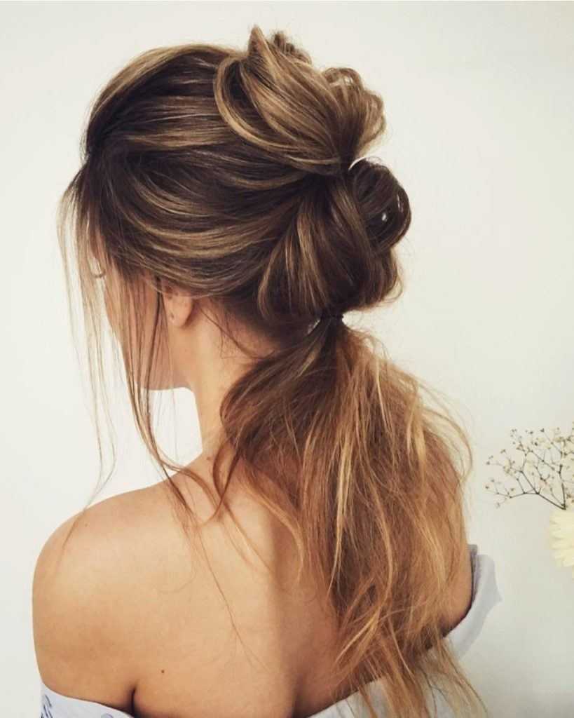 Один из примеров такой укладки – это хвост с начесом. Выполните объем впереди и добавьте эту прядь к хвосту. При этом собирать волосы нужно на затылке, не снизу и не на самом вверху. Такая укладка отлично вписывается в офисный дресс-код, прекрасно гармонирует с повседневными образами.