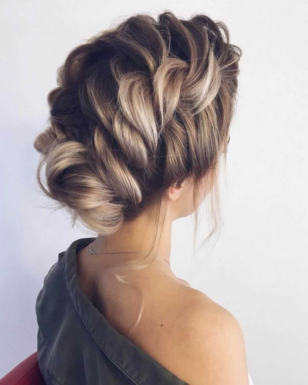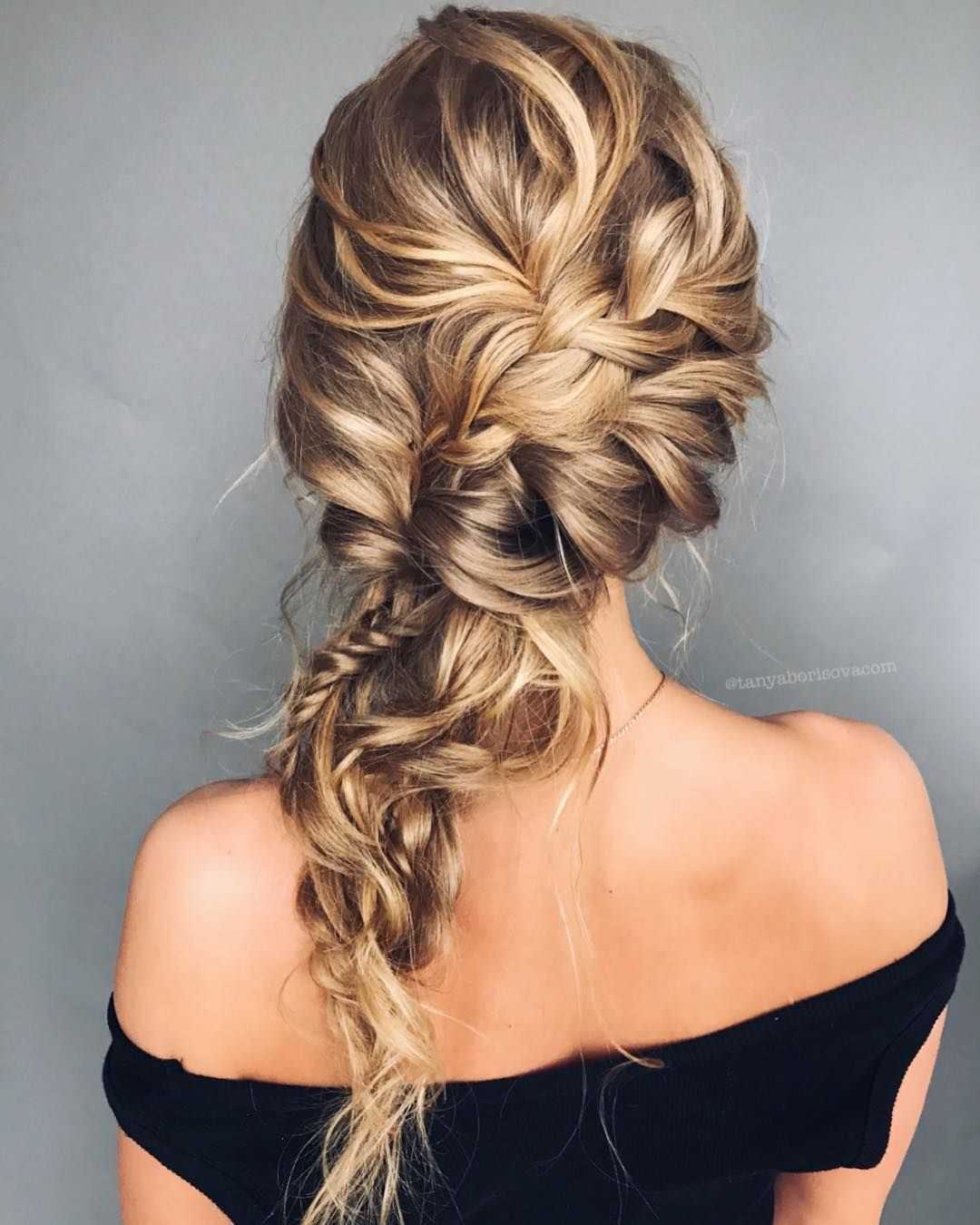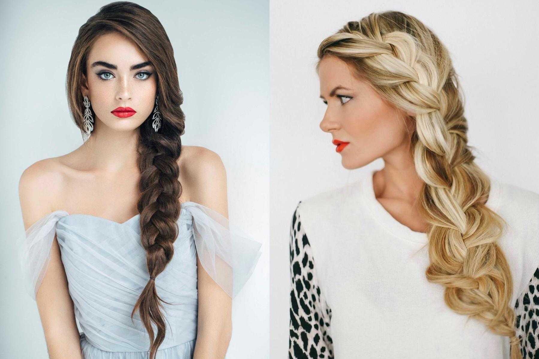 Простое плетение с тремя прядями в прошлом, на его смену пришли косы «рыбий хвост», жгуты, сложное плетение с объемными прядями. Если ваши волосы чуть короче средней длины, то рискните выполнить укладку набок с плетением меньшей стороны волос. Интересно смотрится французское плетение, когда на голове выполнено сразу 5-7 косичек. Примеры таких причесок вы можете найти в фото-подборке в конце обзора.