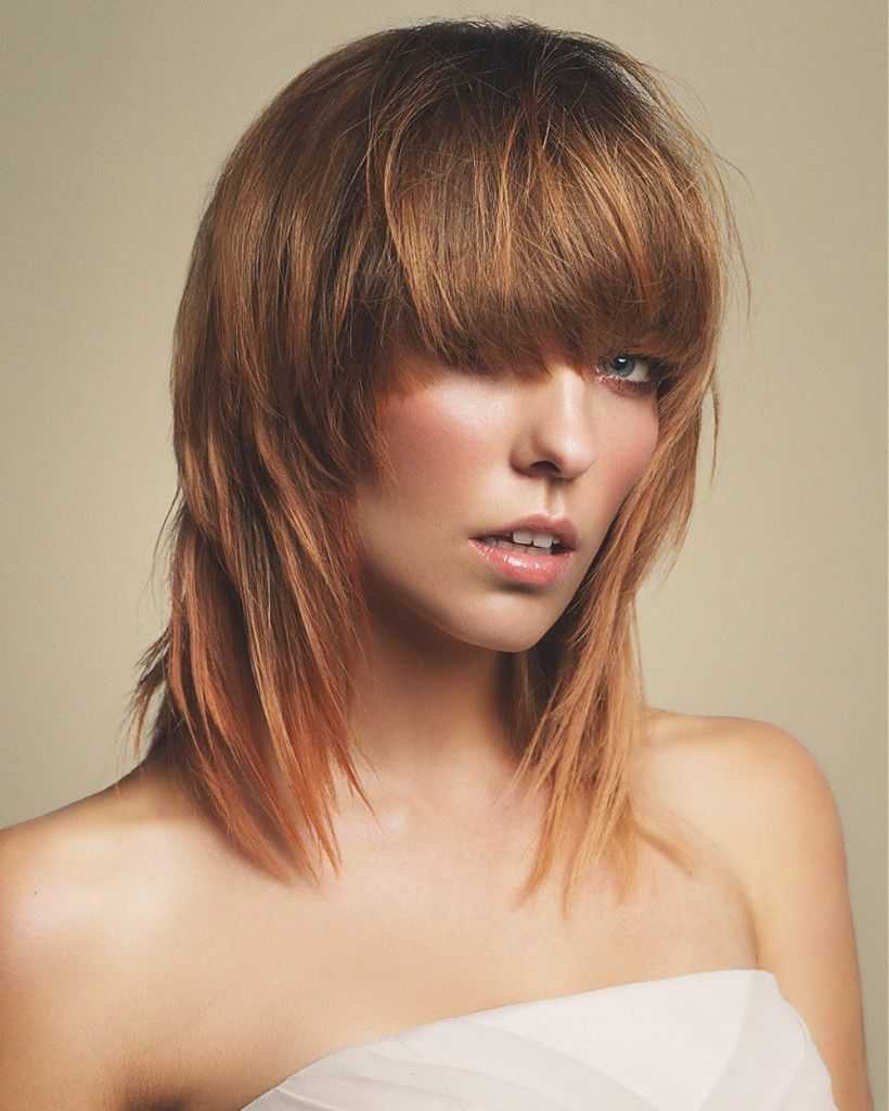 Подобный вариант стрижки прекрасно смотрится, если правильно уложить, приподняв затылочную часть, а обрамляющие овал лица пряди скомбинировать, подкрутив внутрь лицевые пряди, и зафиксировать стайлингом на внешнюю стороны пряди на плечах и спине. «волчица» на средних волосах в сочетании с тяжелой густой челкой — идеальный ответ современным модным тенденциям, представляя собой универсальный и стильный вариант.