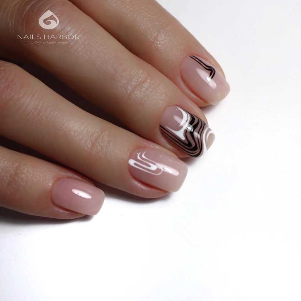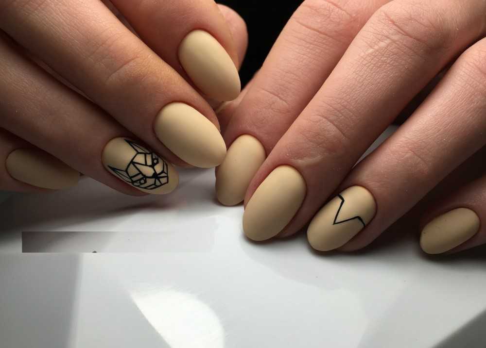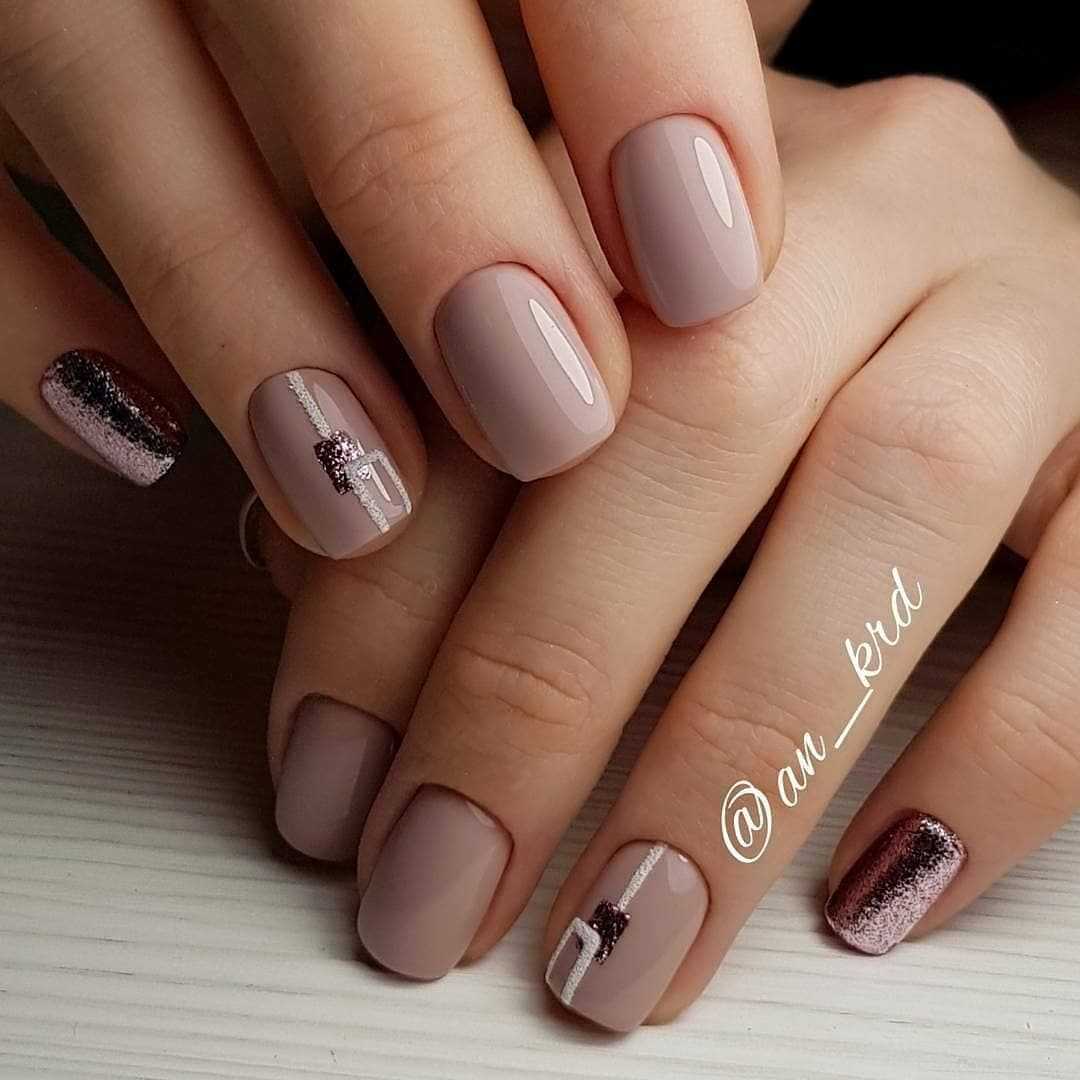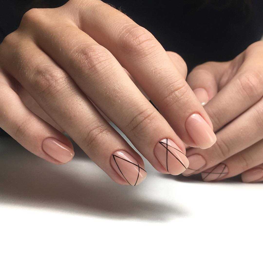 Однако это вовсе не значит, что нужно останавливаться на однотонном покрытие. В технике нейл-минимализма присутствуют такие элементы как тонкие и прямые линии, геометрические фигуры и элементарный дизайн. Как правило, это либо ненавязчивый дизайн всех ногтей, либо чуть более выраженный всего одного пальчика. Для любительниц коротких ногтей – такое решение придется по душе. Единственное, чтобы зрительно увеличить длину ногтей, дополнительные элементы располагайте вертикально и по диагонали.