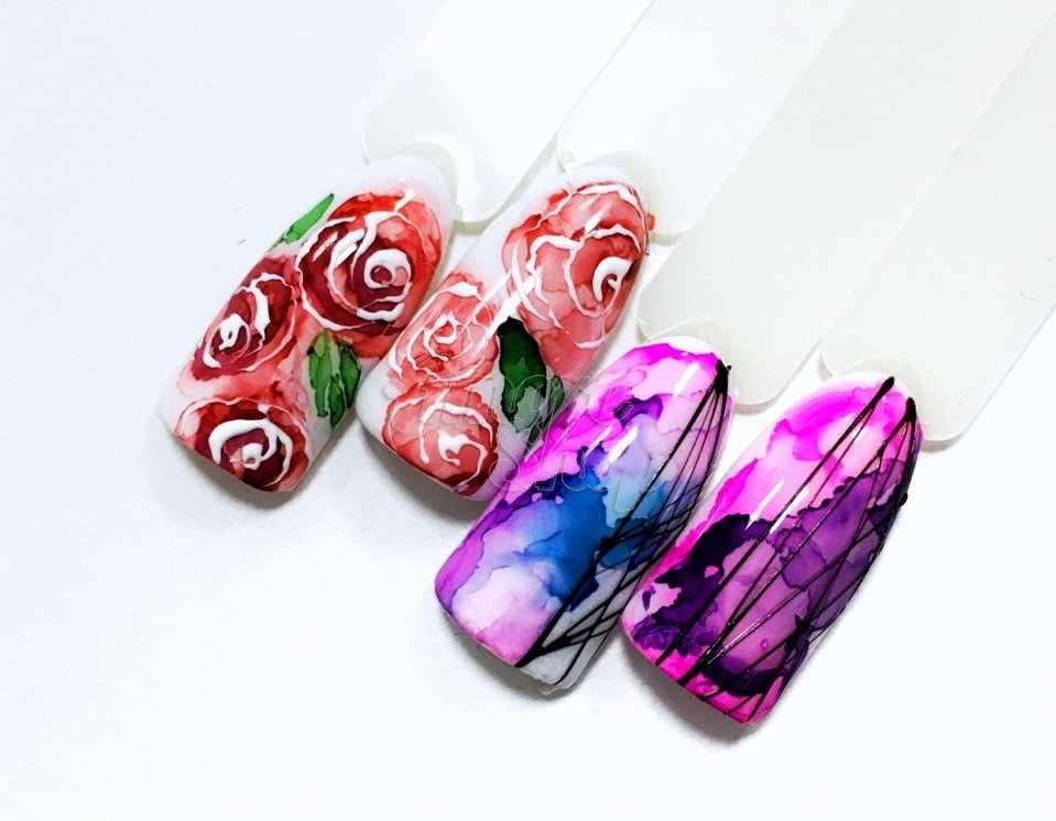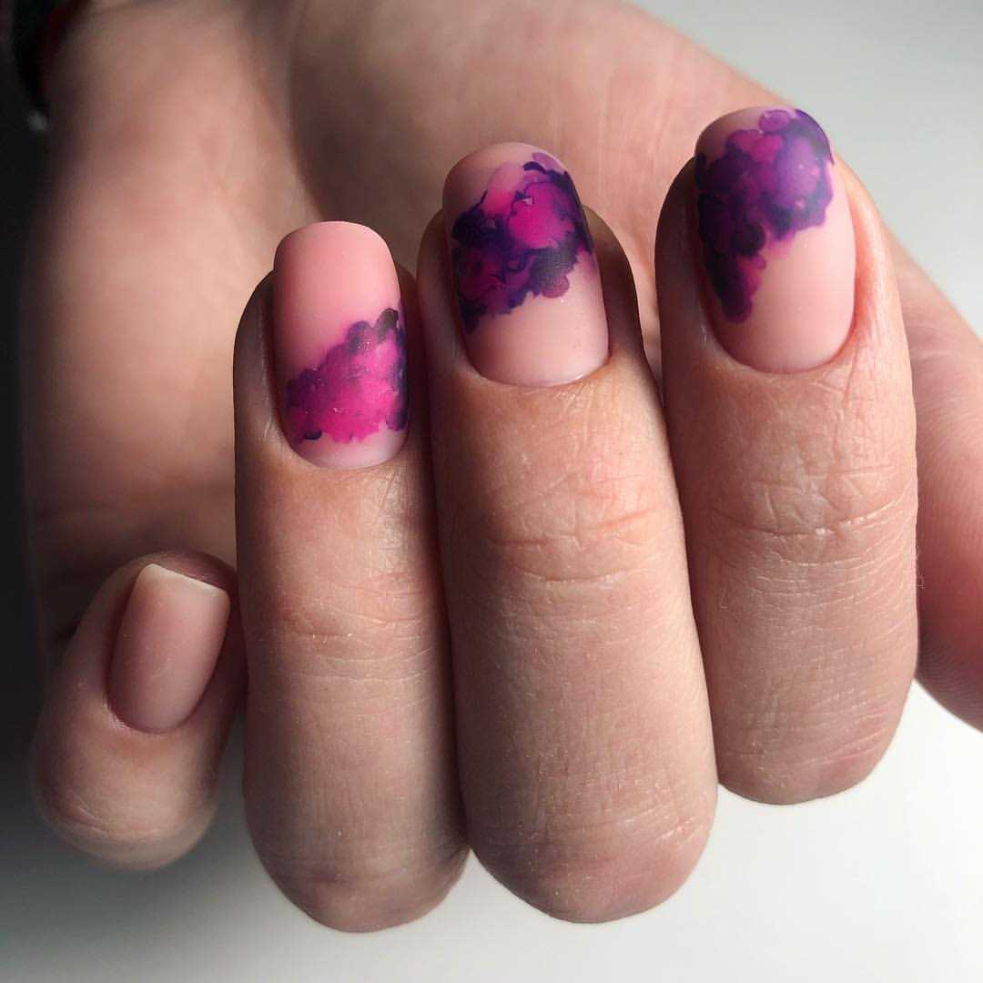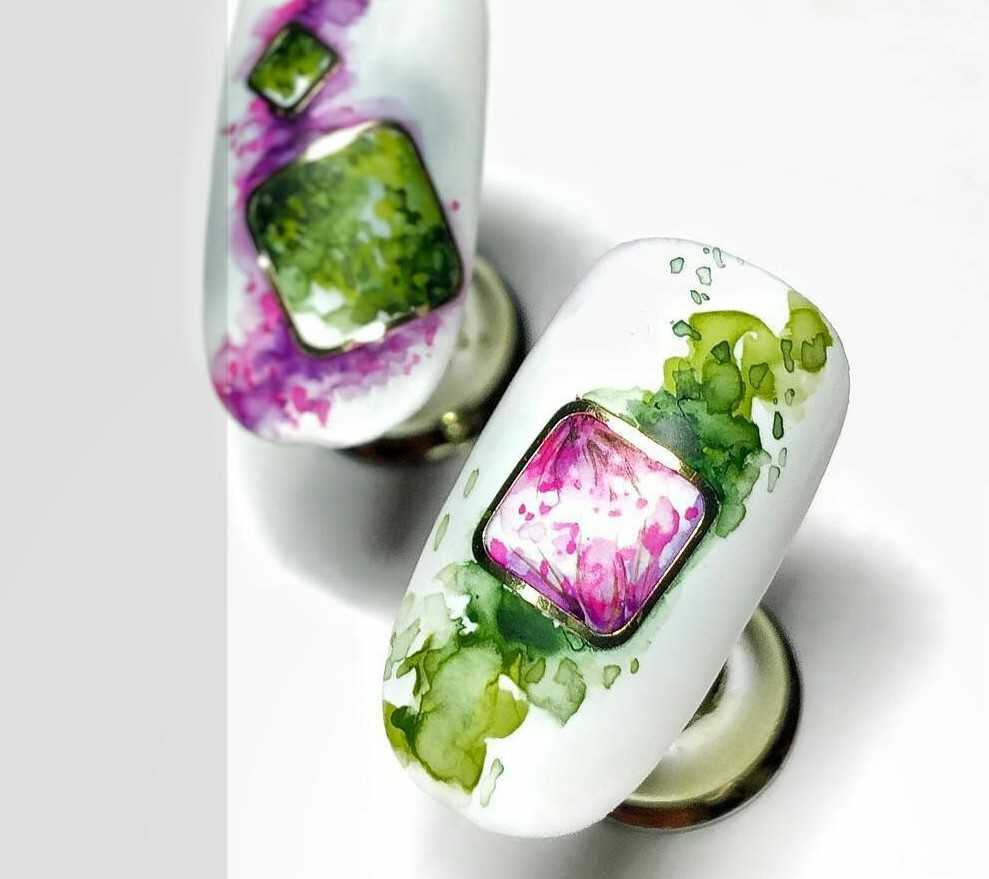 Еще один яркий и сочный вариант дизайна на лето. Требует некоторых затрат, но работать с этими каплями легко, а результат того стоит. С помощью акварельных капель выполняют абстрактные рисунки, серый дым, растушеванный дизайн с цветами, подобие морских волн, маникюр в стиле минимализм и т. д. Границы зависят от фантазии мастера. Хотя вензеля и геометрия акварелью вряд ли получатся. Скорее эти капли пригодятся для художественной росписи. Некоторые умудряются выполнять ими целые пейзажи.