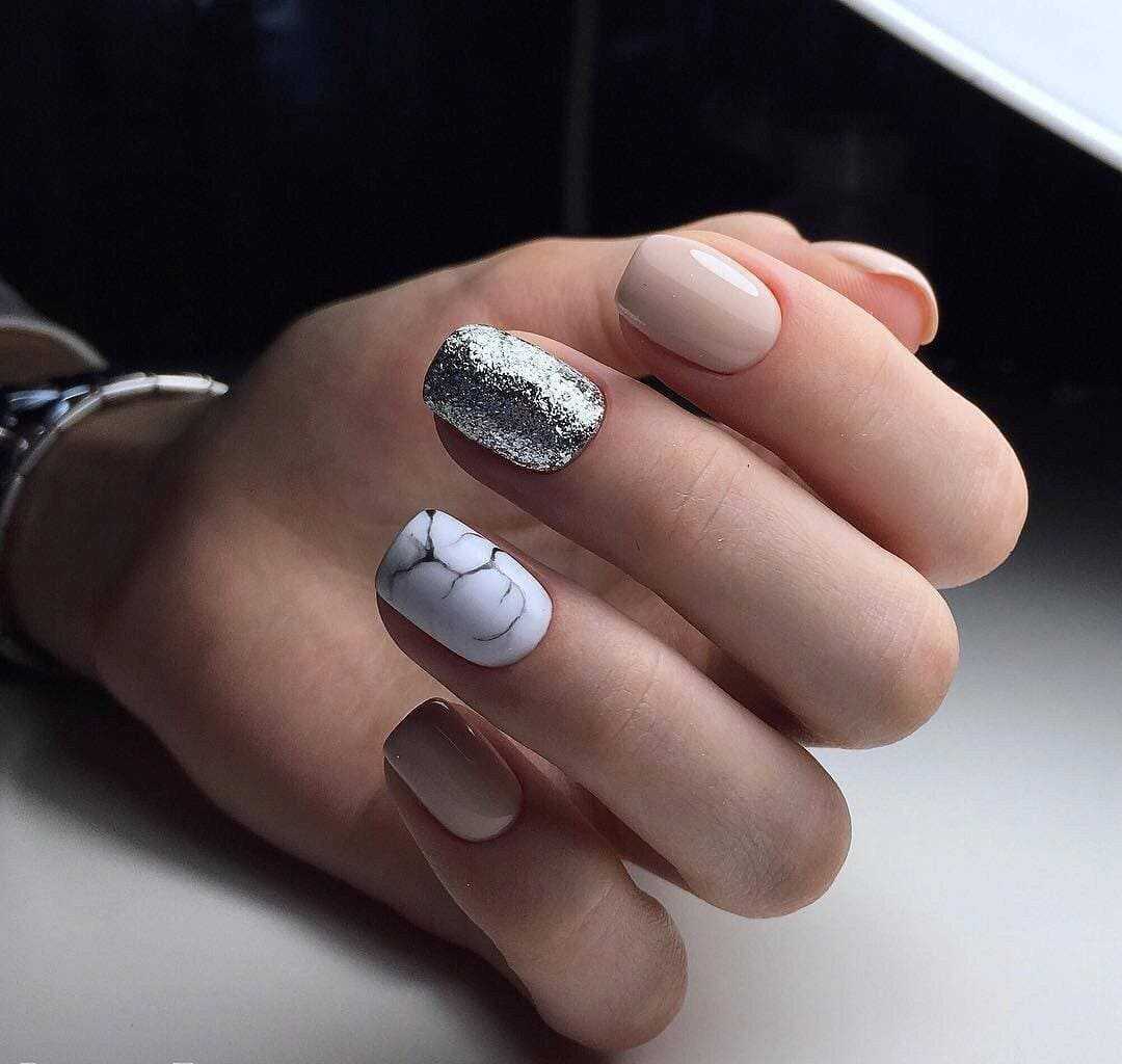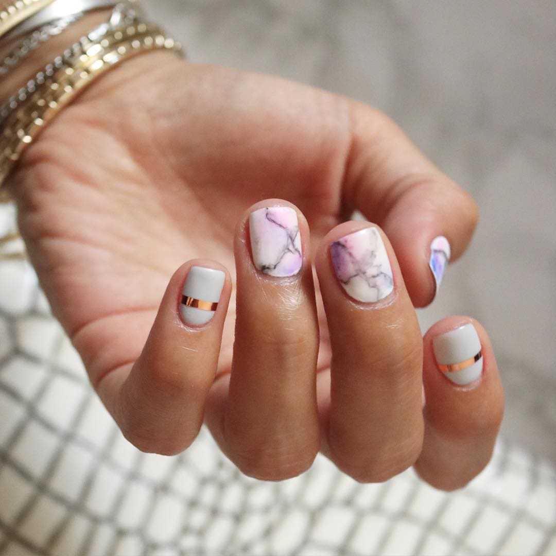 Также можно добавлять нюдовые оттенки, чтобы придать рисунку правдоподобный вид. Мраморный узор будет отлично смотреться как на всех ногтях, так и в качестве декоративного элемента, например, на безымянном или большом пальце. Если для декора не используются блестящие лаки, такой маникюр подойдет для повседневной носки или для тех, кто работает в офисе со строгим дресс-кодом.