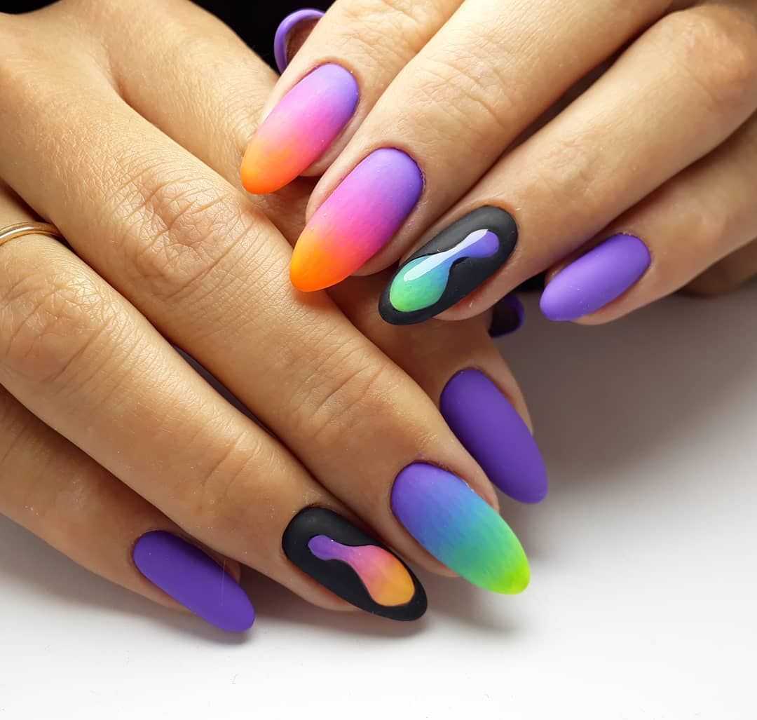 Сочетать подобные оттенки можно по-разному. Это могут быть полоски, геометрические фигуры или обыкновенные кляксы. Такая цветовая вариация очень популярна в салонах красоты среди молодых девушек.