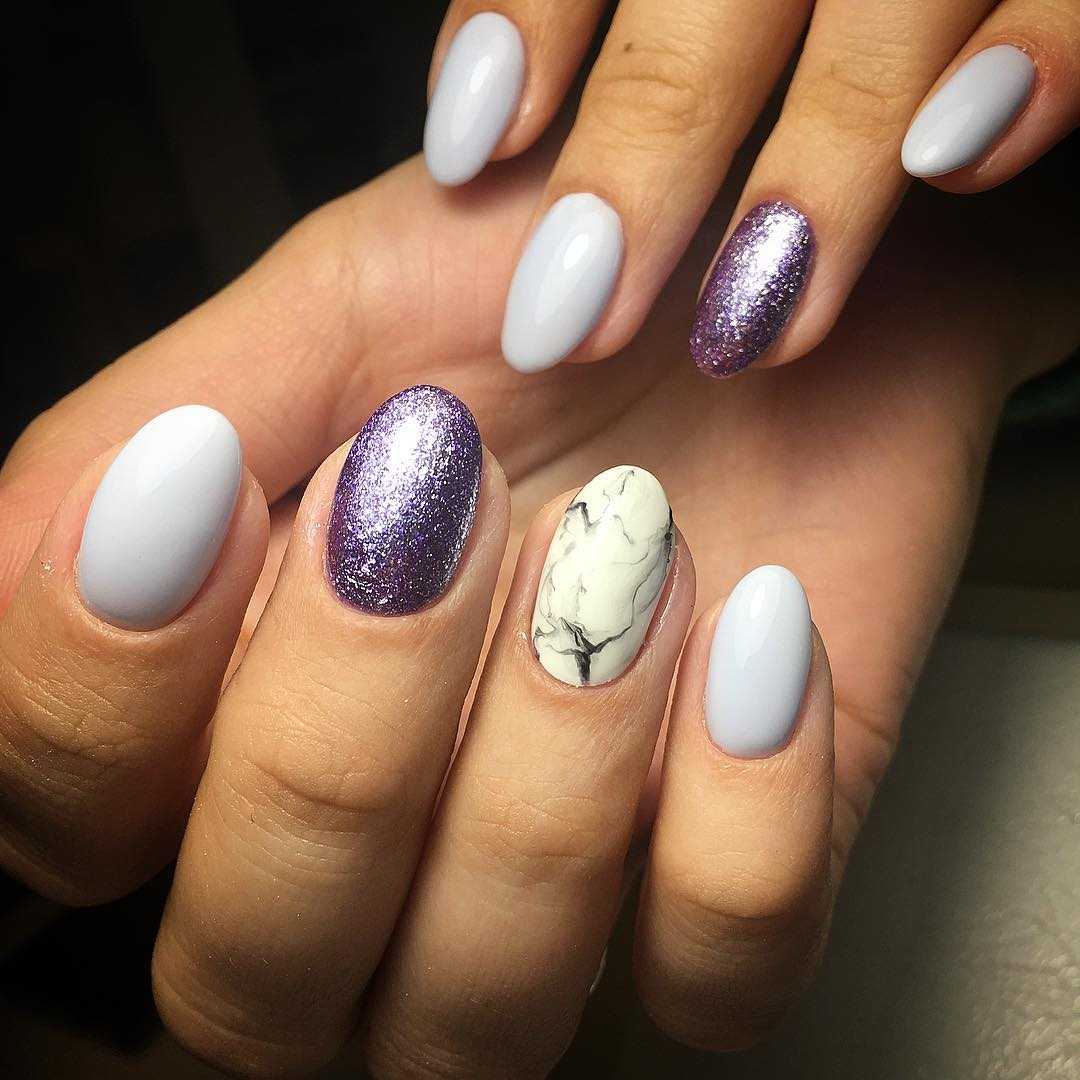 Белый маникюр с блёстками и стразами может легко подружиться с другими оттенками лаков. Например, в ход может идти вся пастельная палитра, черный и красный цвет.