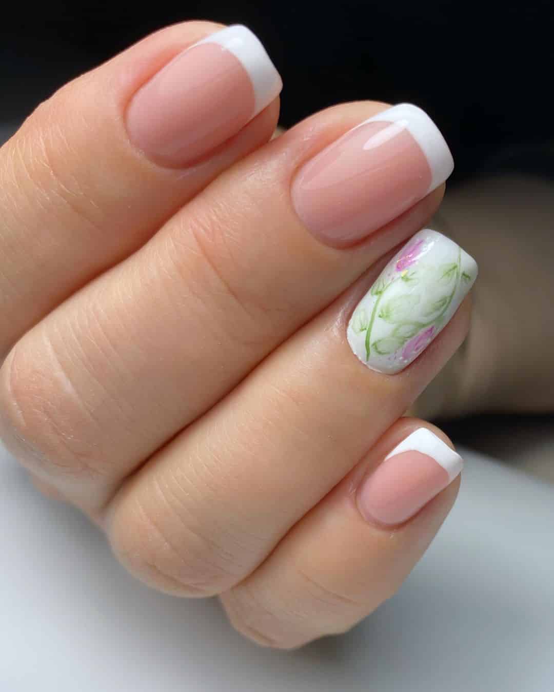Еще один интересный вариант оформления ногтей. В связи с приближающей весной, все больше девушек стремится себе создать теплое, позитивное, радостное настроение. А в этом помогут цветочные мотивы. Рисунки могут быть нарисованы вручную, но если вы сомневаетесь в своем художественном таланте, то смело используйте специальные наклейки. Конечно, помимо цветов, существует множество и других не менее интересных вариантов – осколки стекла, геометрия, абстракция, полоски, кружочки, веточки.
