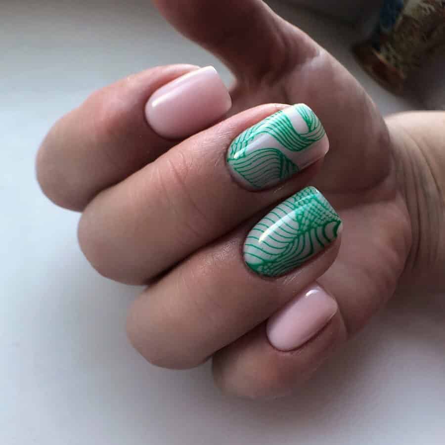 Нежный, непринужденный и спокойный маникюр можно выполнить на квадратных ногтях короткой длины. Лучше применить 3 различных стиля в 1. Понадобится лак бирюзового, белого и серебристого цвета. Эффект камня рекомендуется сделать из водных наклеек или тонкой кисти с применением лака черного, темно-коричневого оттенка или акриловой краски.